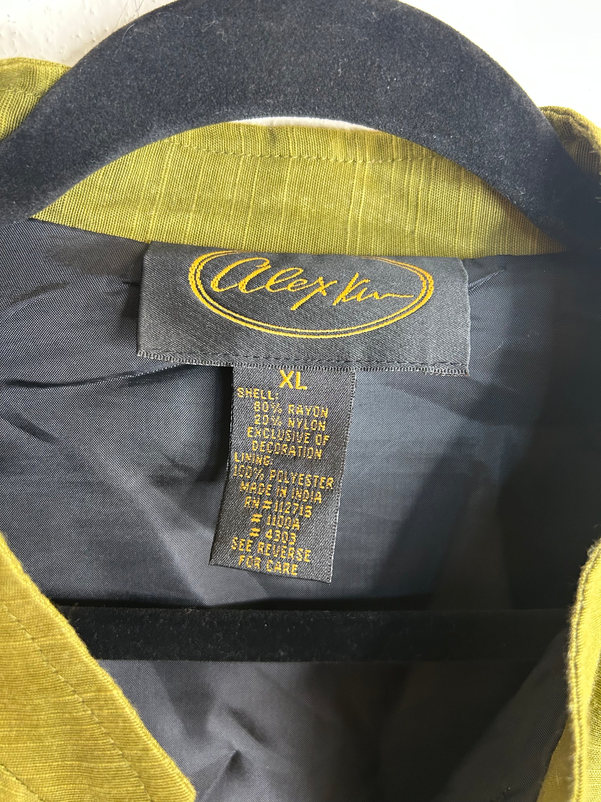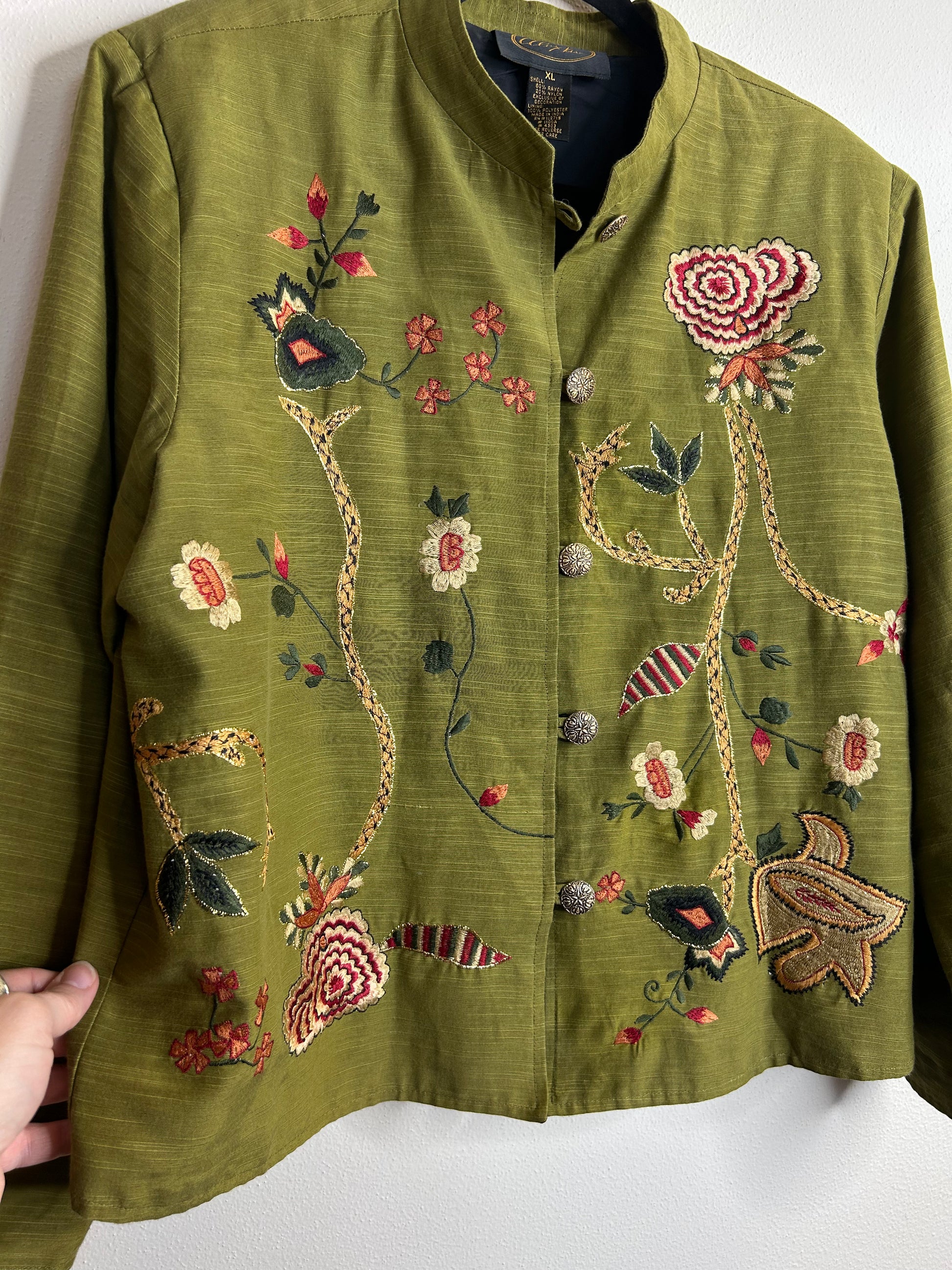 Alex Kim green embroidered jacket womens XL, no pockets, plastic buttons.