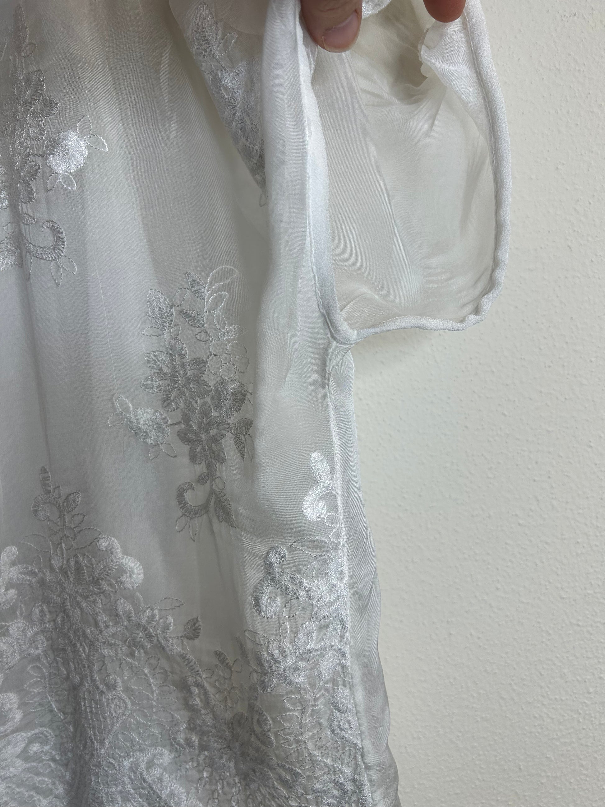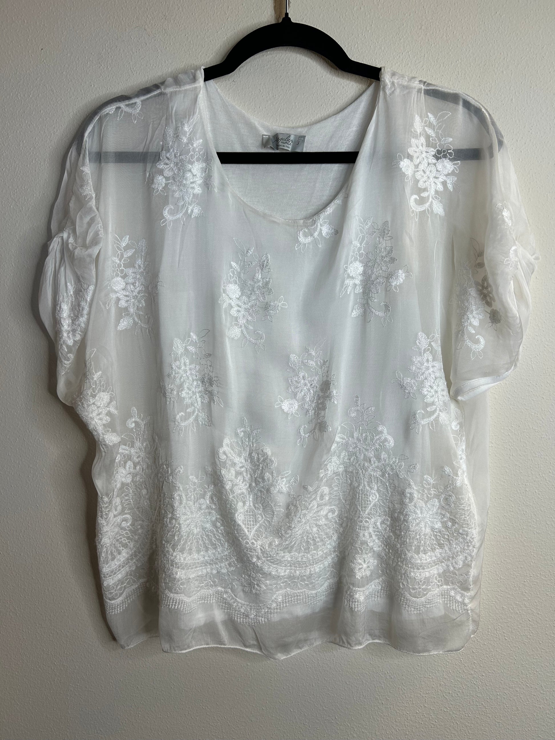 Angela Moda white silk blend blouse womens size S, connected white tank underneath a sheer embroidered top. cap sleeves