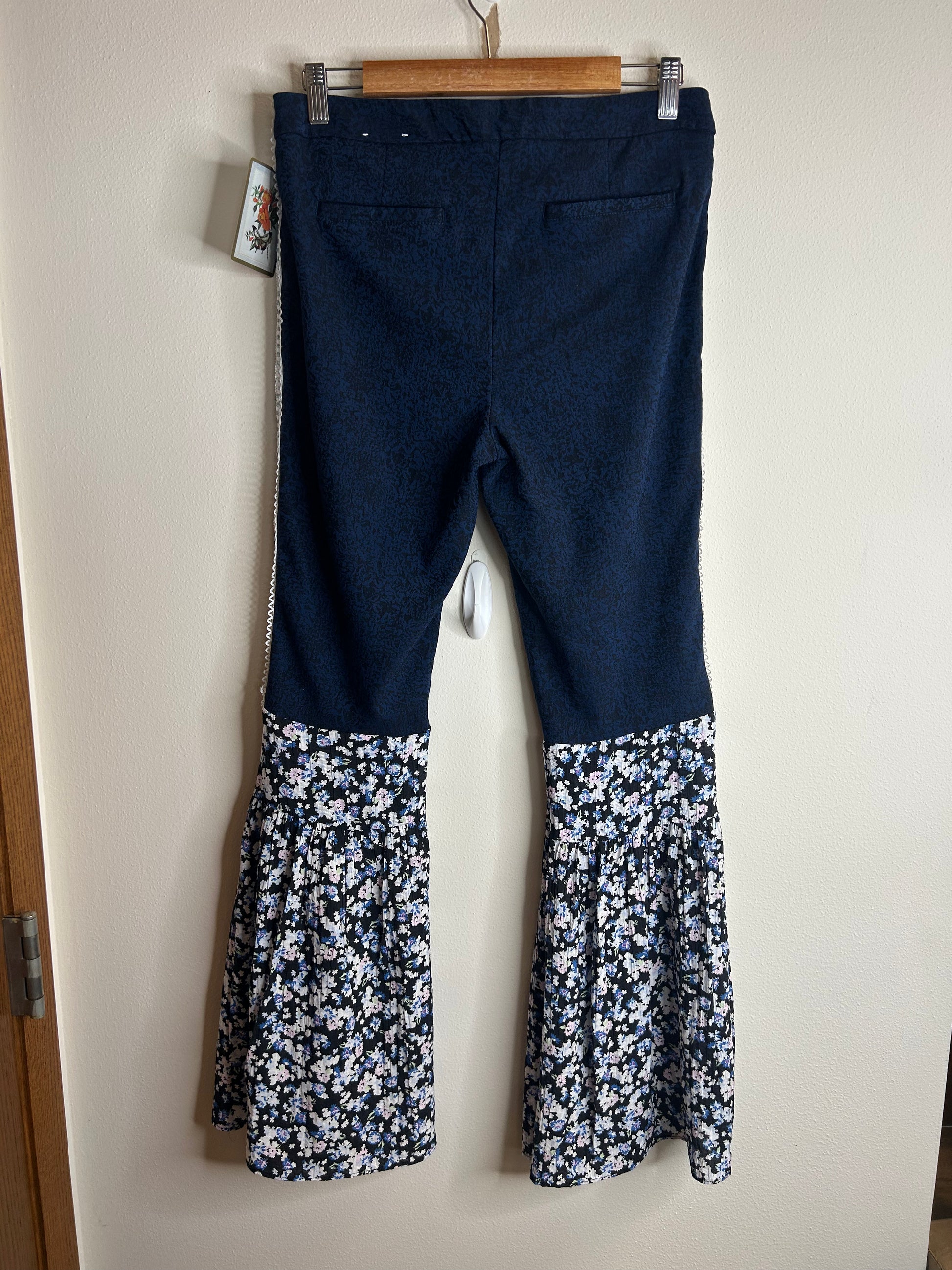 Upcycled blue floral flare pants, women’s size 8, 2 back pockets