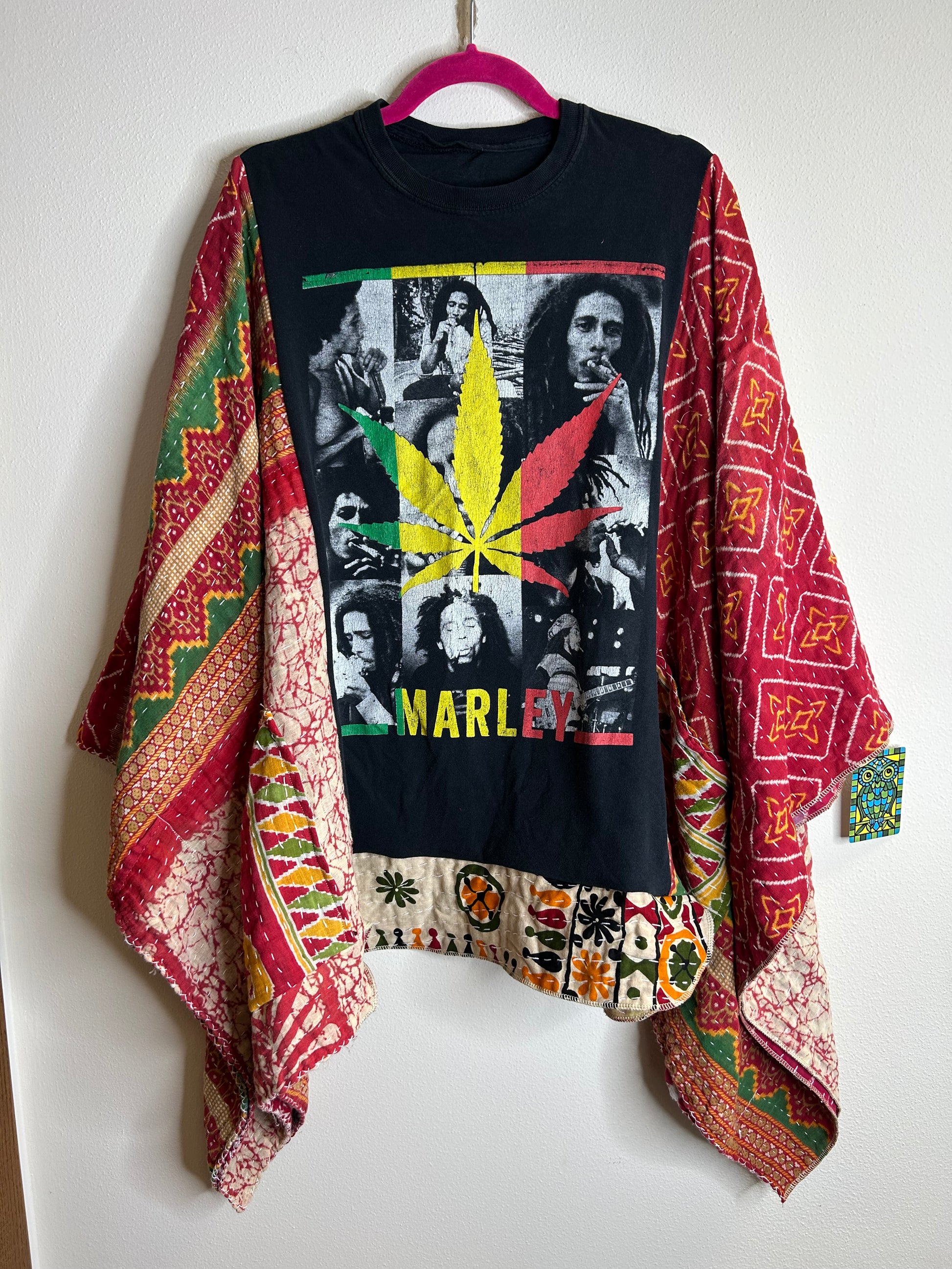 Bob Marley upcycled kantha poncho -one size fits most, pullover style, 2 front pockets, fits sizes S-3x