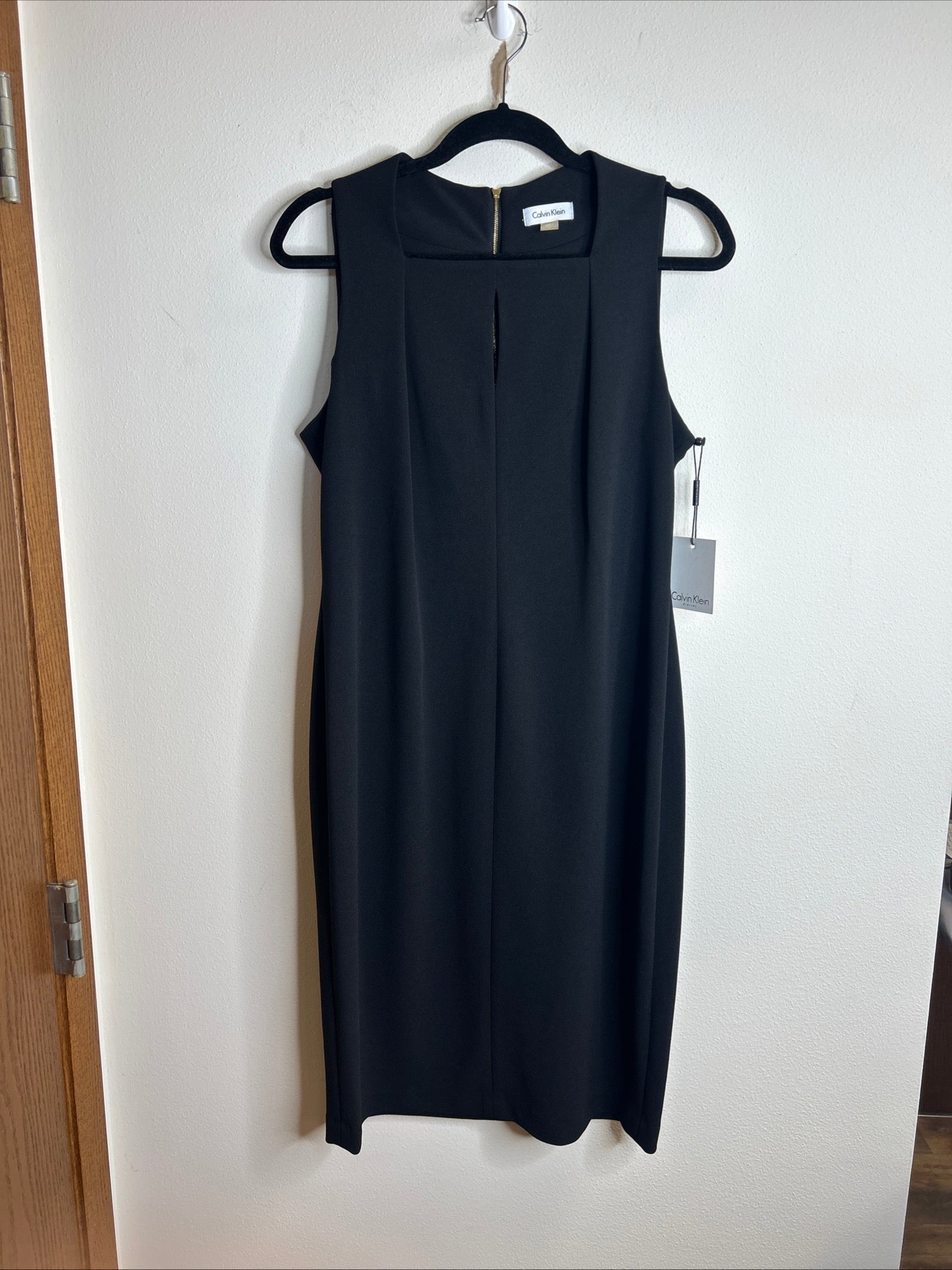 Calvin Klein LBD, gold zipper closure, sleeveless, womens size 12, NWT, cut out peekaboo hole on chest area.