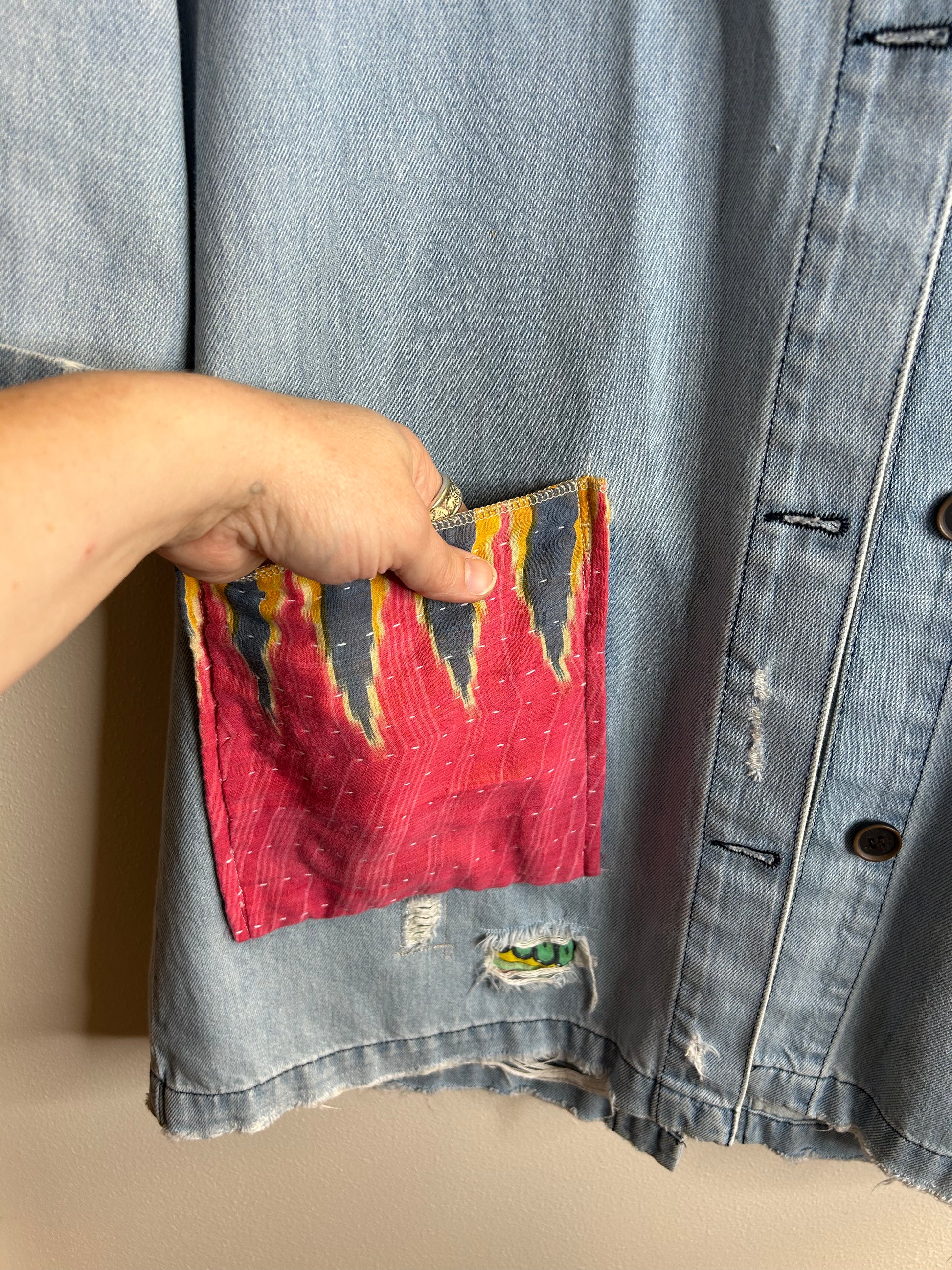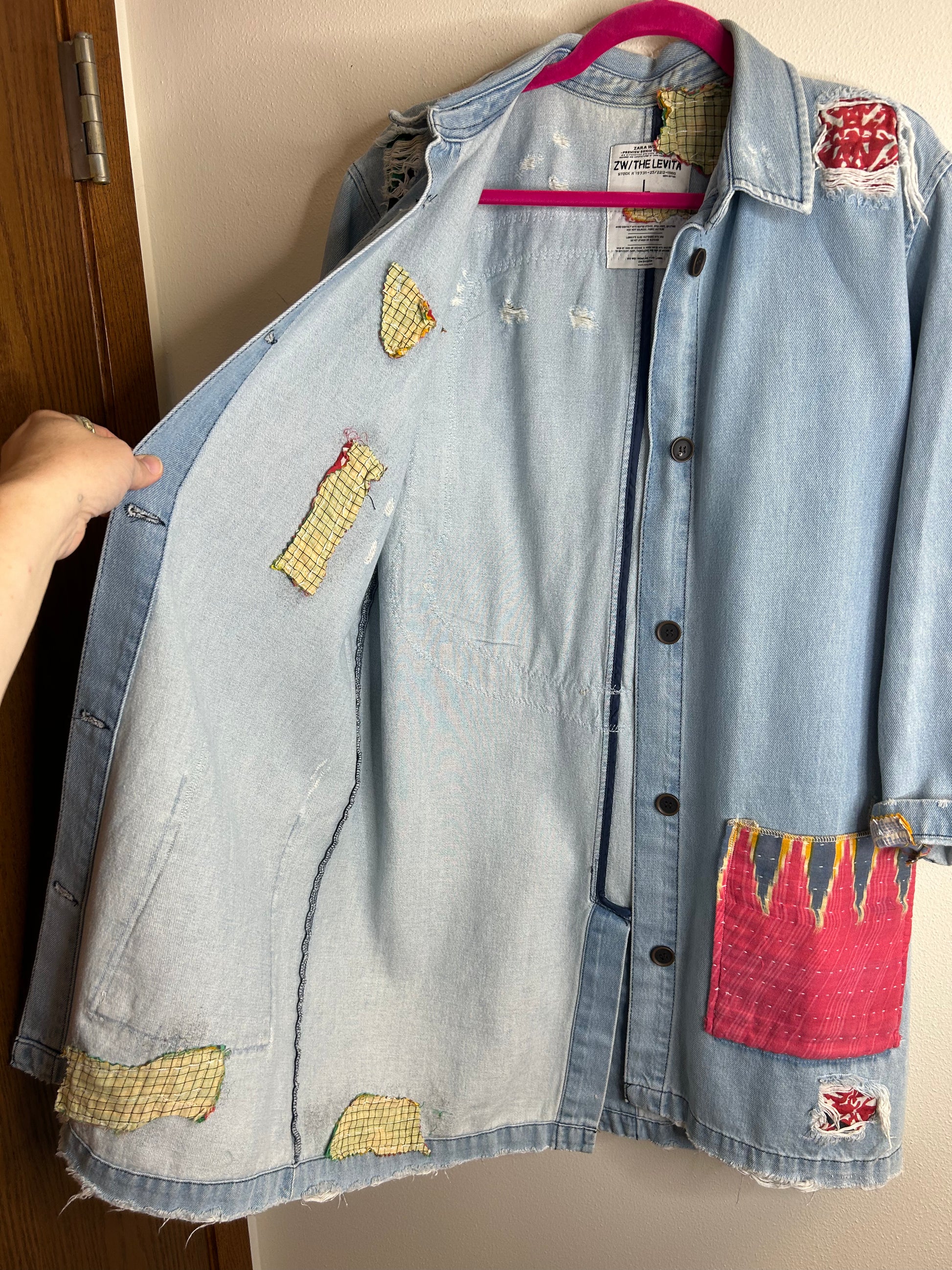 Country Vibes upcycled denim jacket womens size L/XL, 100% cotton, 2 pockets added to front, patched distressed holes, button up closure, 3/4 length sleeves
