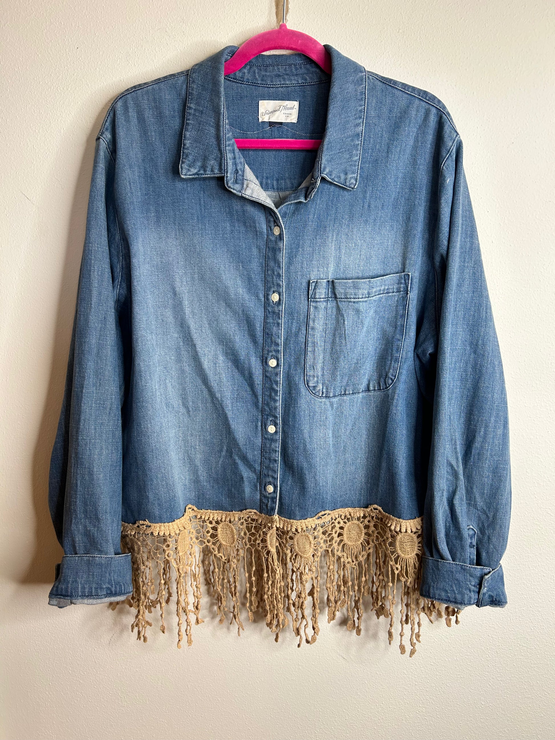 Crotchet fringe upcycled denim shirt, womens size 2x, 1 front pocket, button closure