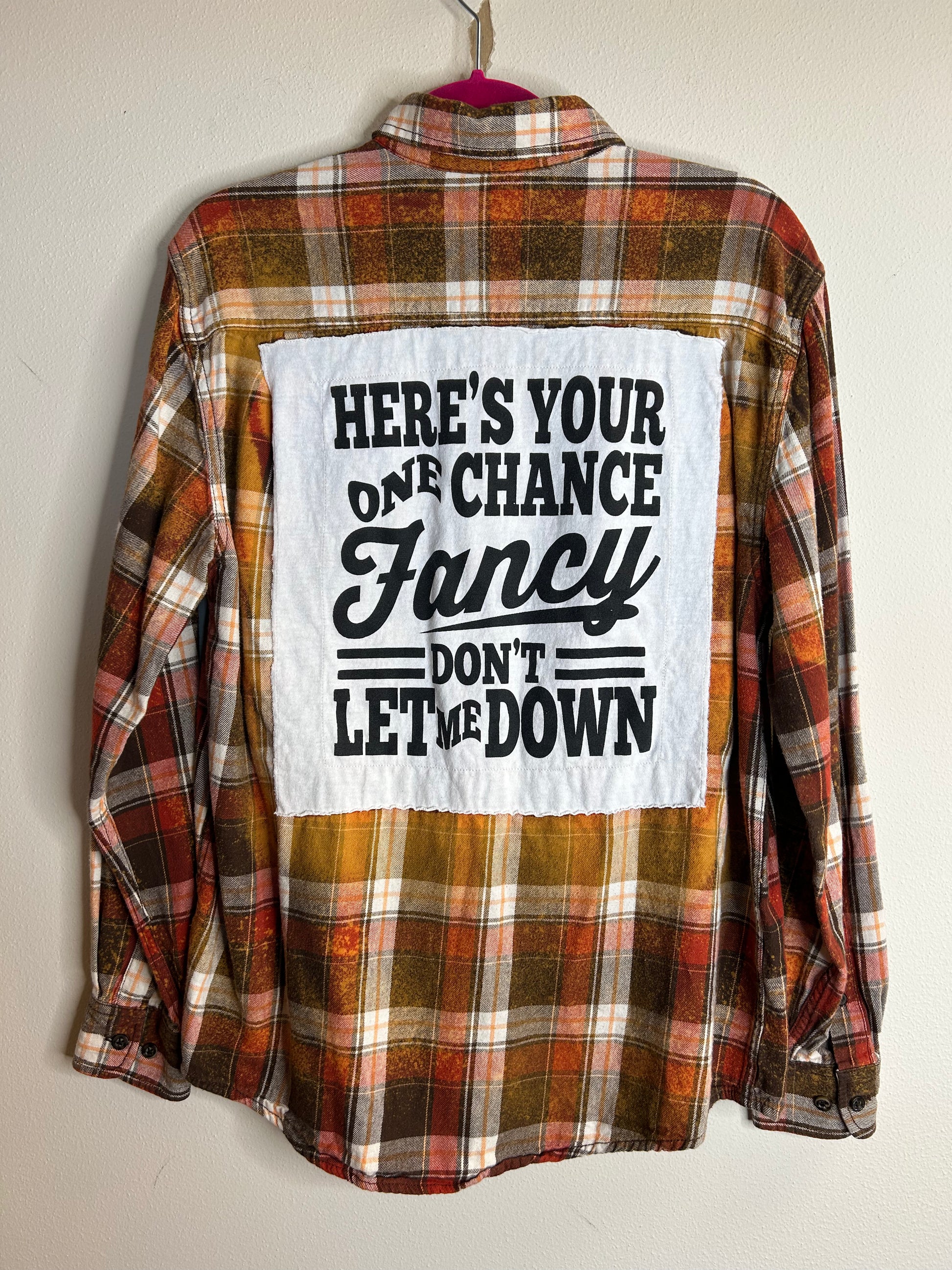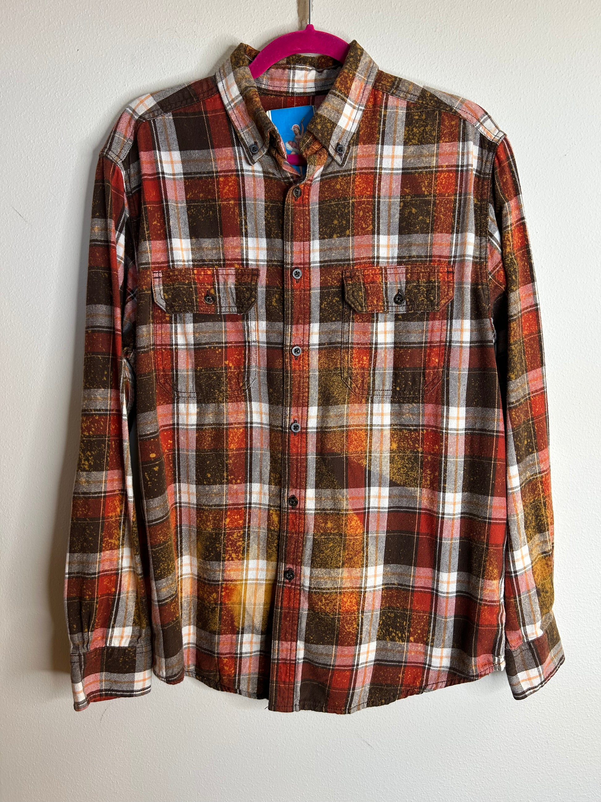 Fancy upcycled flannel shirt, unisex size M, 2 front pockets, button closure, bleach effect added.