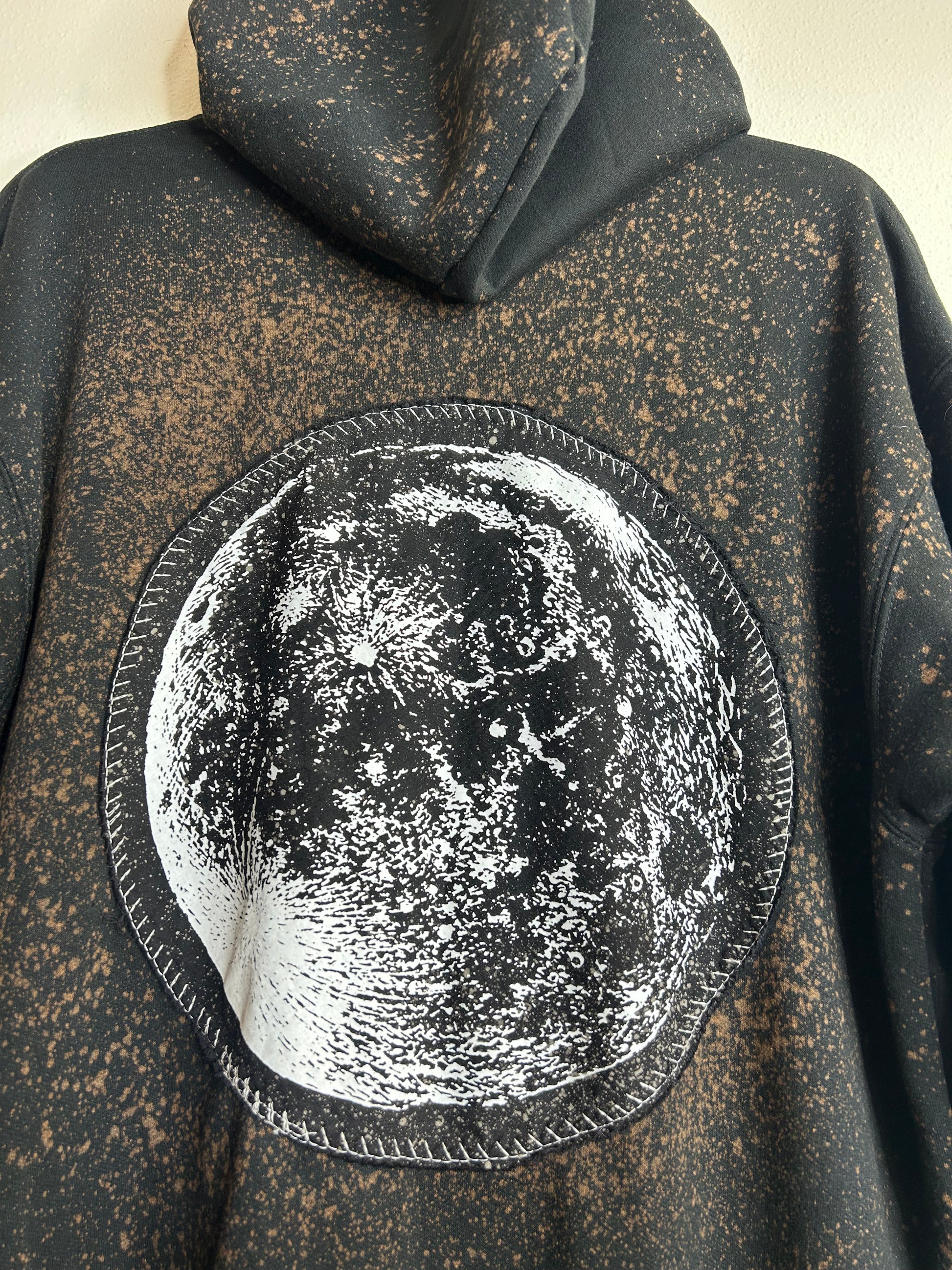 Full Moon upcycled hoodie unisex size L, zipper closure, 2 front pockets, 50% cotton, 50% polyester, bleach effect added, handmade patches, wash and dry on low/cool settings or handwash and line dry.