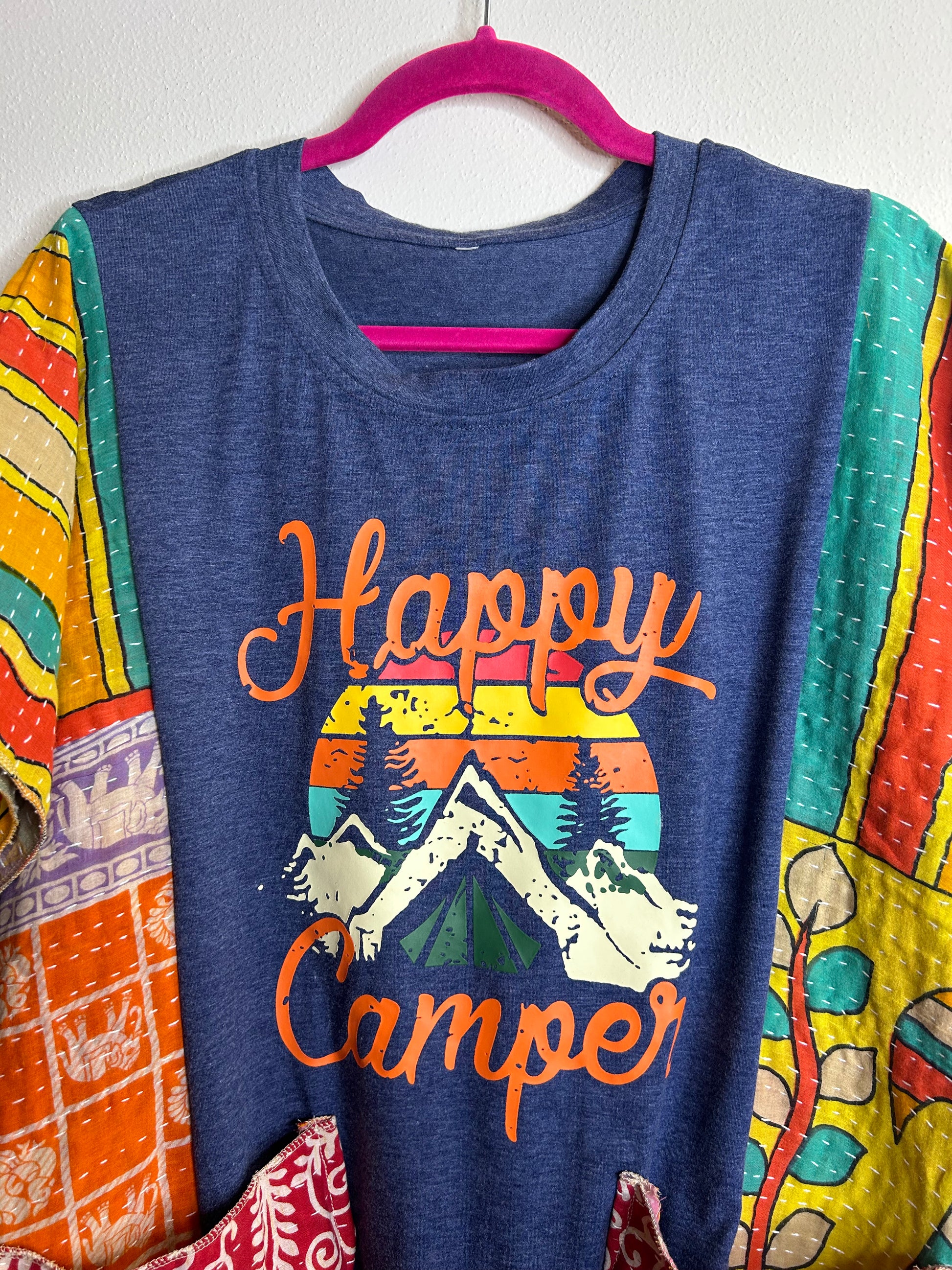 Happy Camper upcycled kantha top, like a half poncho-one size fits most, pullover style, 2 front pockets, fits sizes S-3x