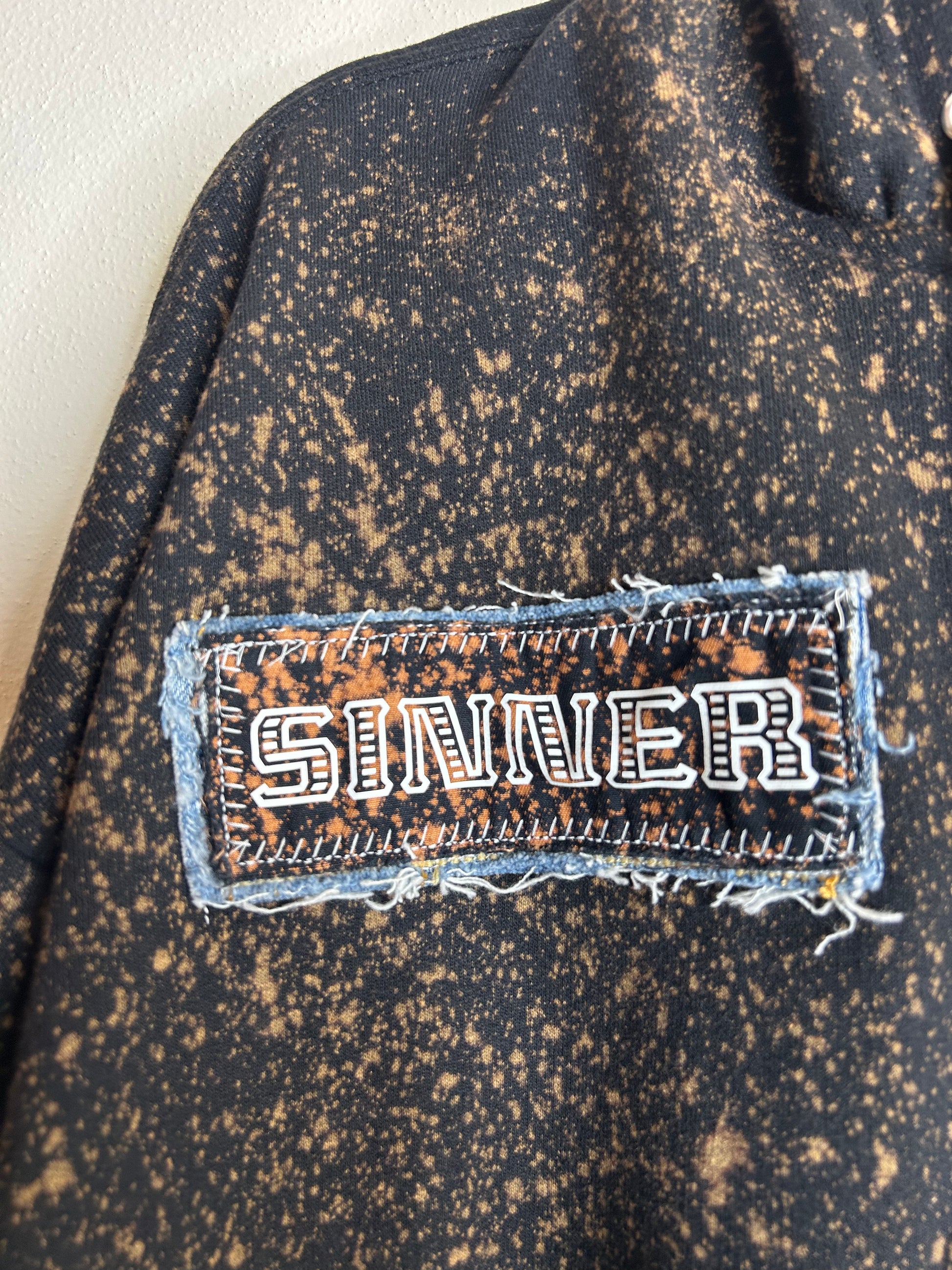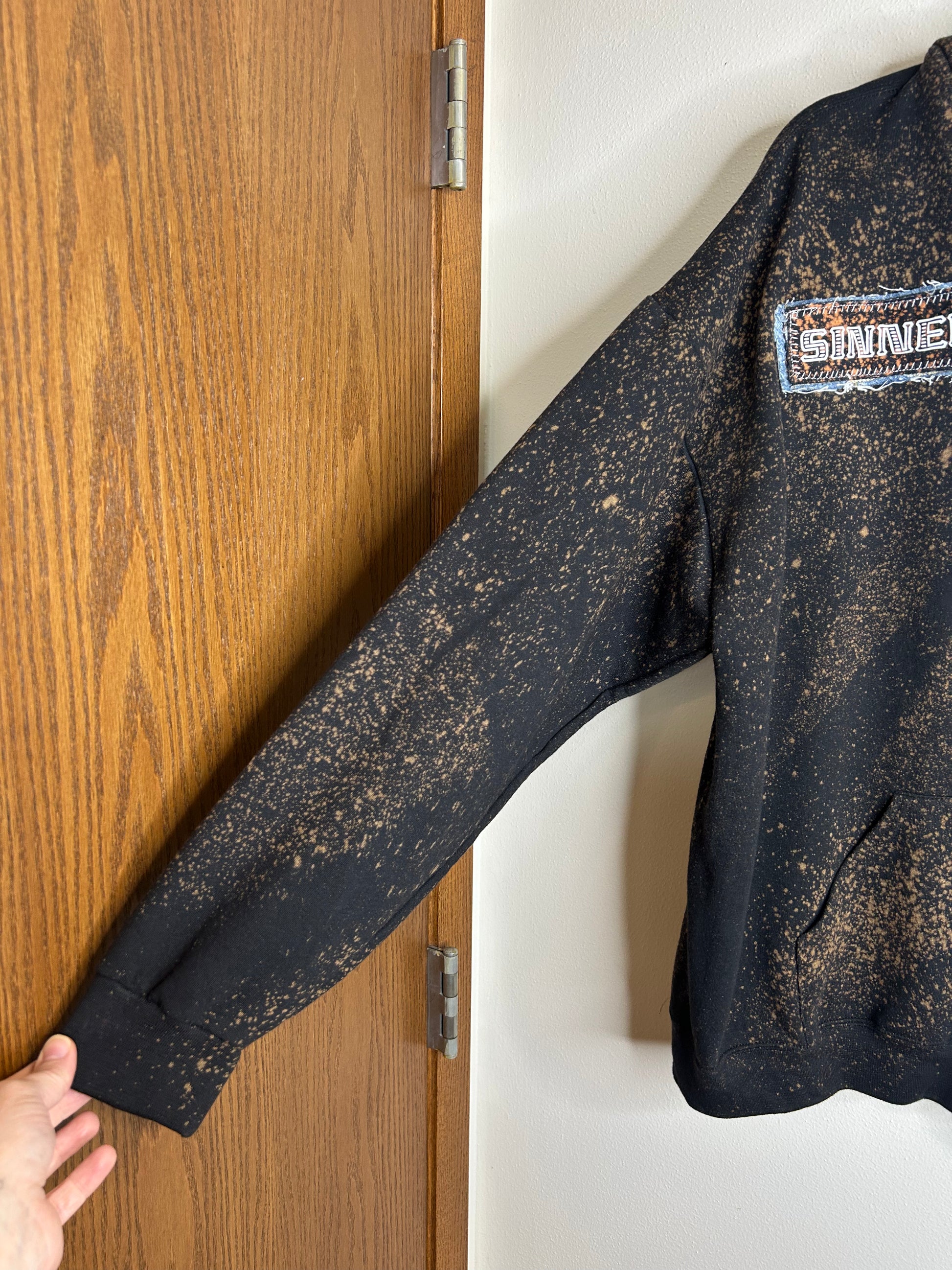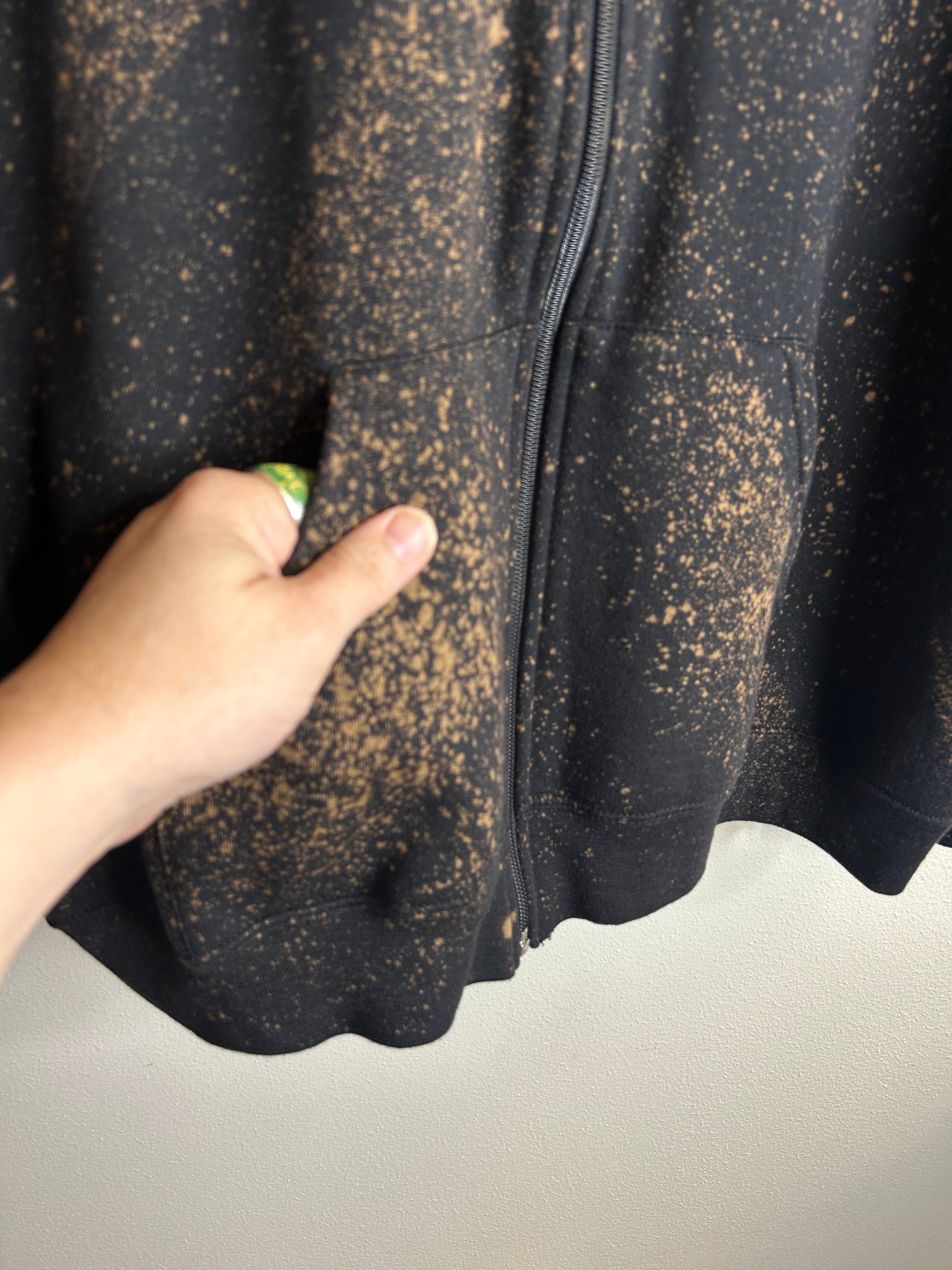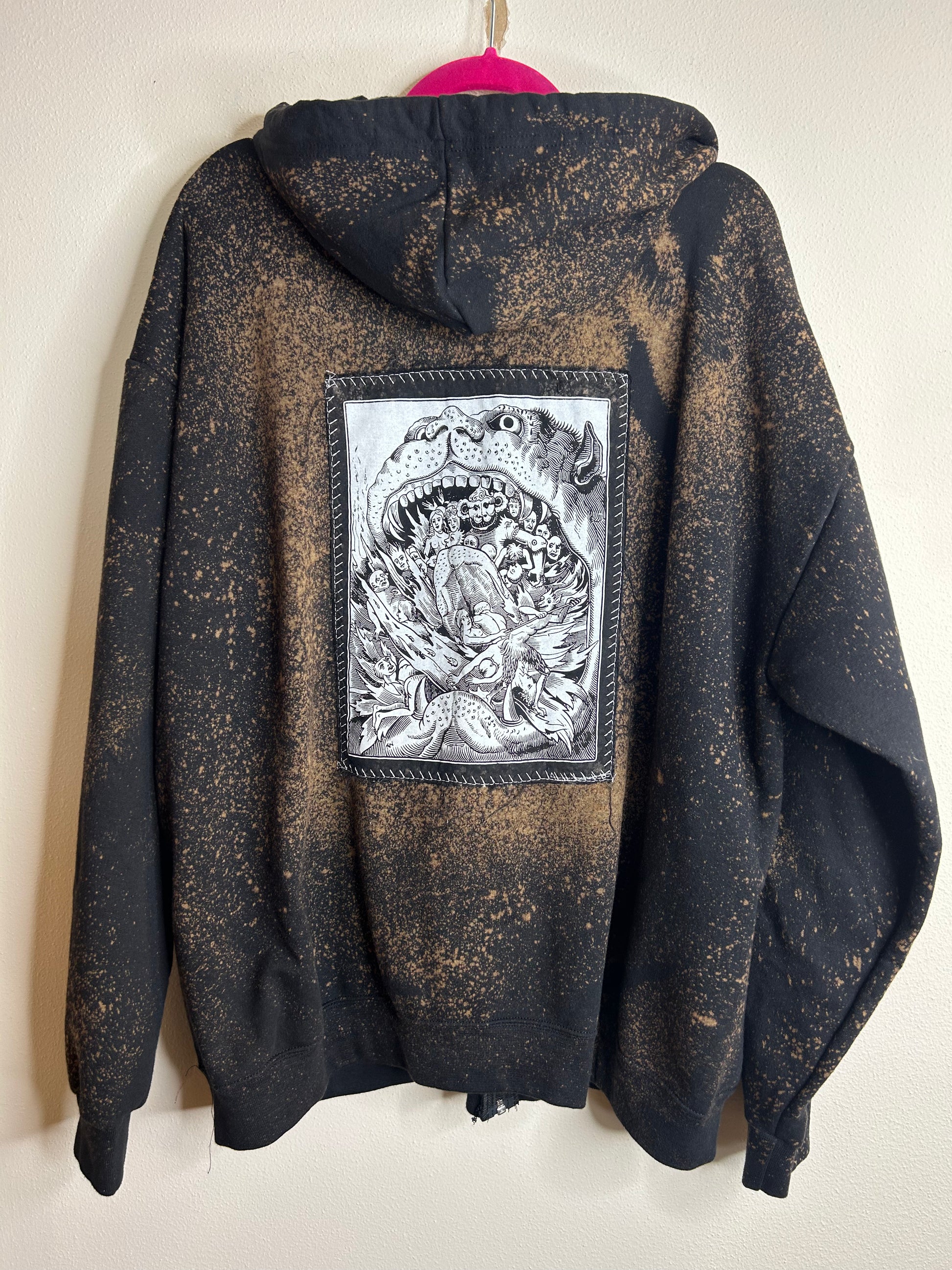 Hell Monster upcycled hoodie unisex size 2X, zipper closure, 2 front pockets, 50% cotton, 50% polyester, bleach effect added, handmade patches, wash and dry on low/cool settings or handwash and line dry.