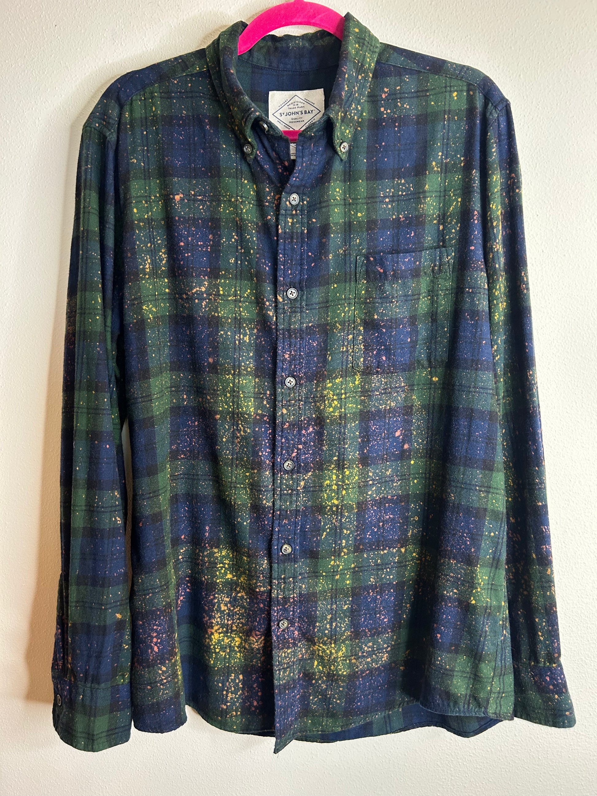 IT horror upcycled flannel shirt, mens/unisex M, 1 front pocket, button closure, 100% cotton, bleach effect added.