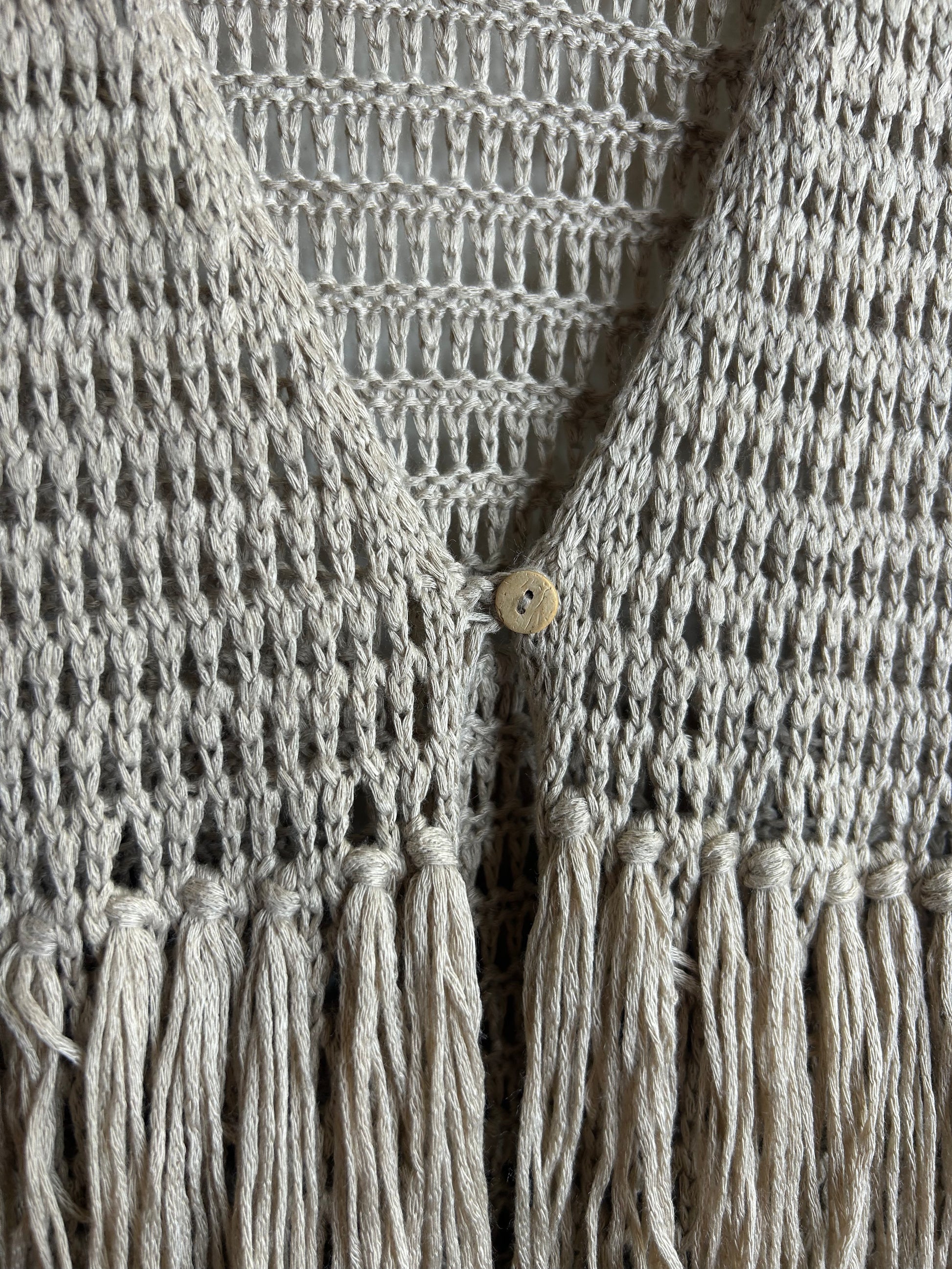Kori America women’s M/L boho hippie crotchet beige tan fringe long vest. 1 button closure. Elegant cream crochet vest. Features fringe accents. Ideal for layering.
