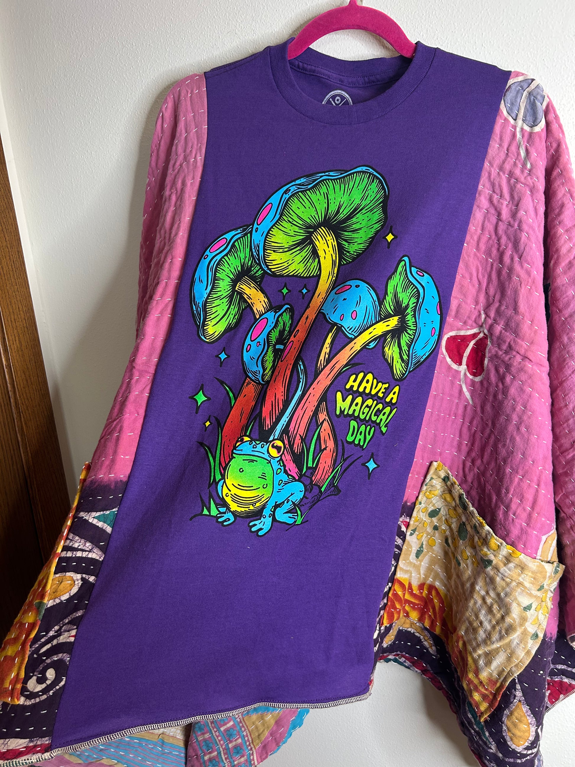 Have a Magical Day upcycled kantha poncho -one size fits most, pullover style, 2 front pockets, fits sizes S-3x