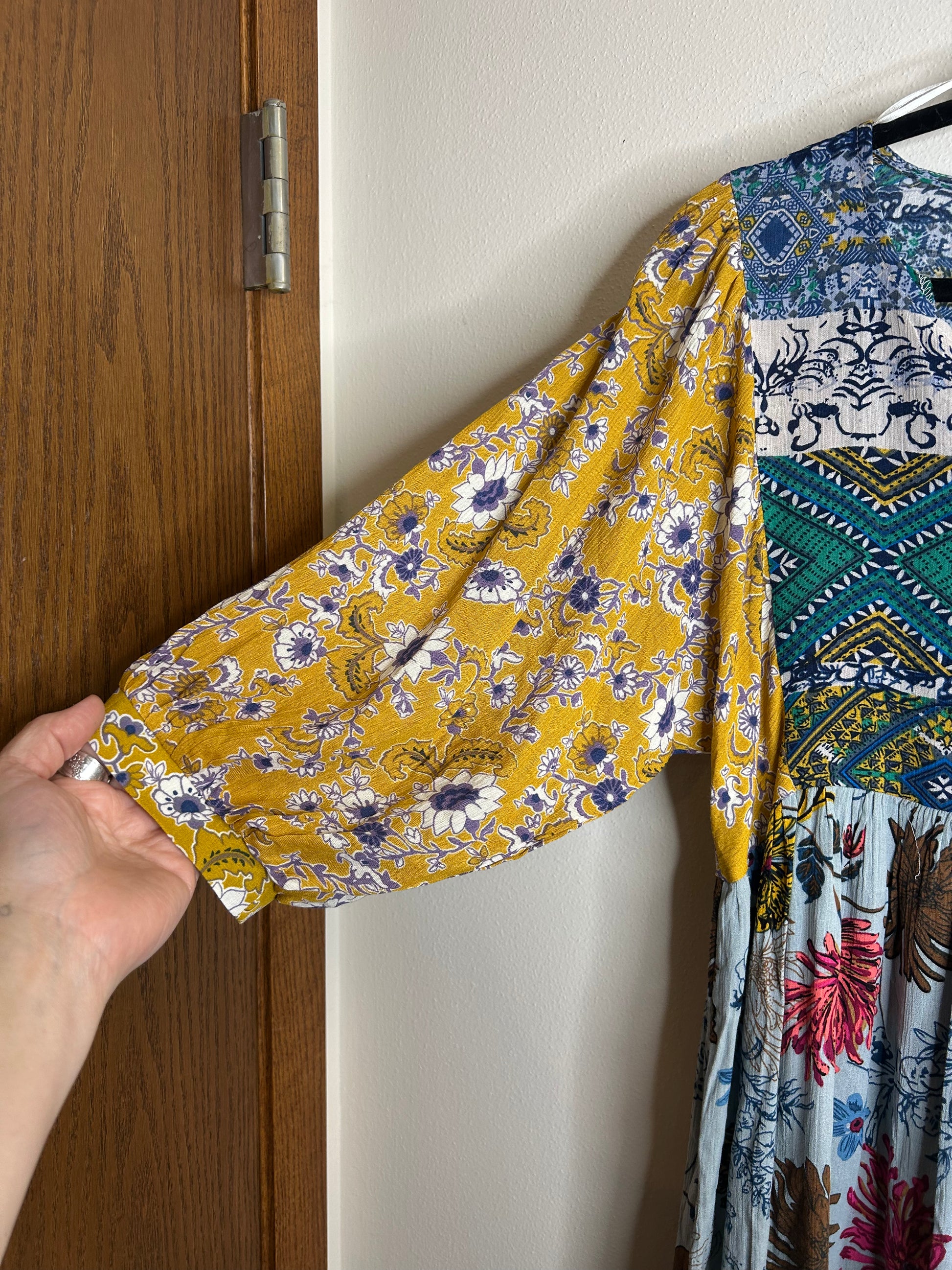 Vibrant dress featuring a mix of floral patterns. Includes shades of yellow, green, and red.