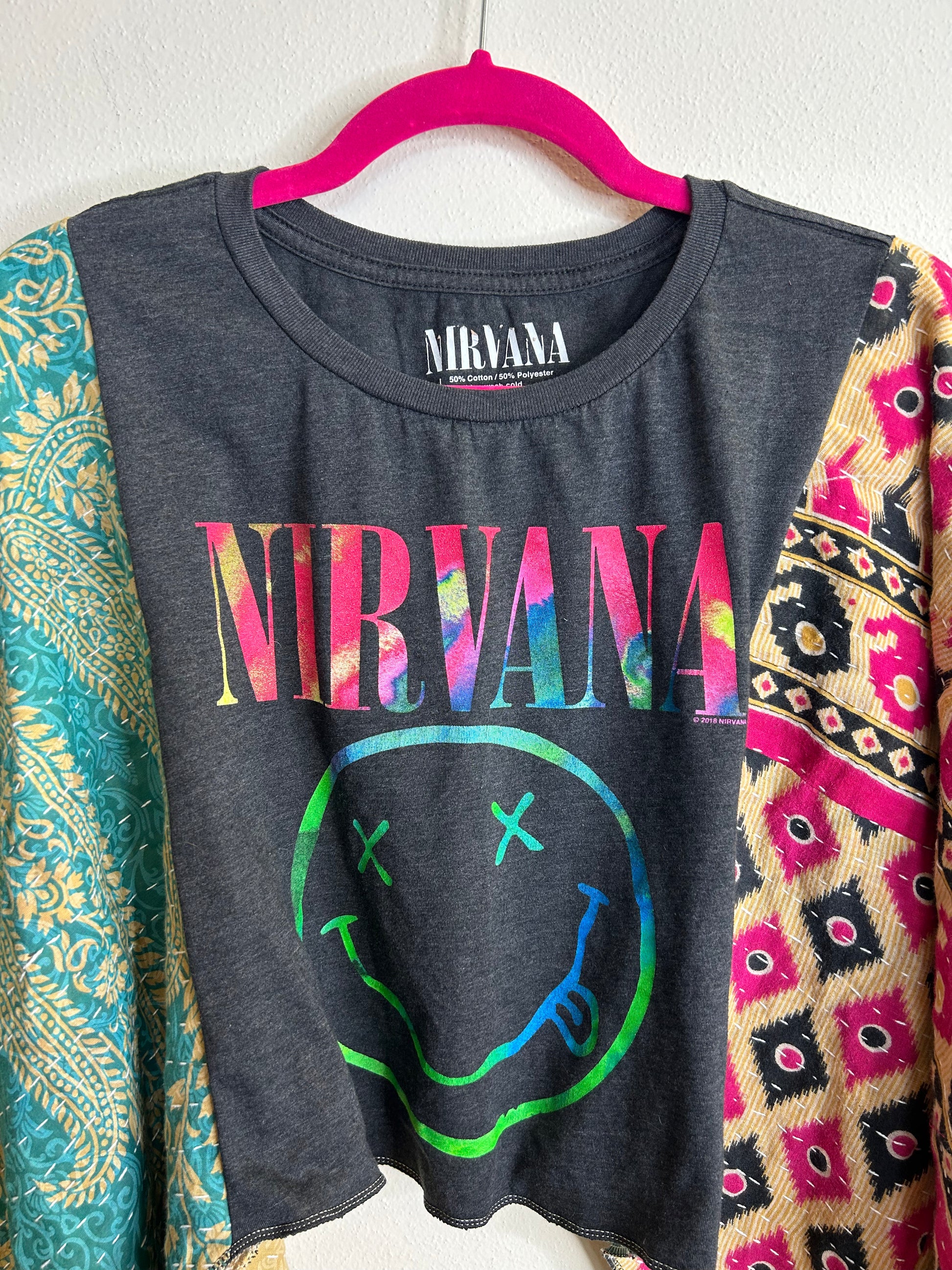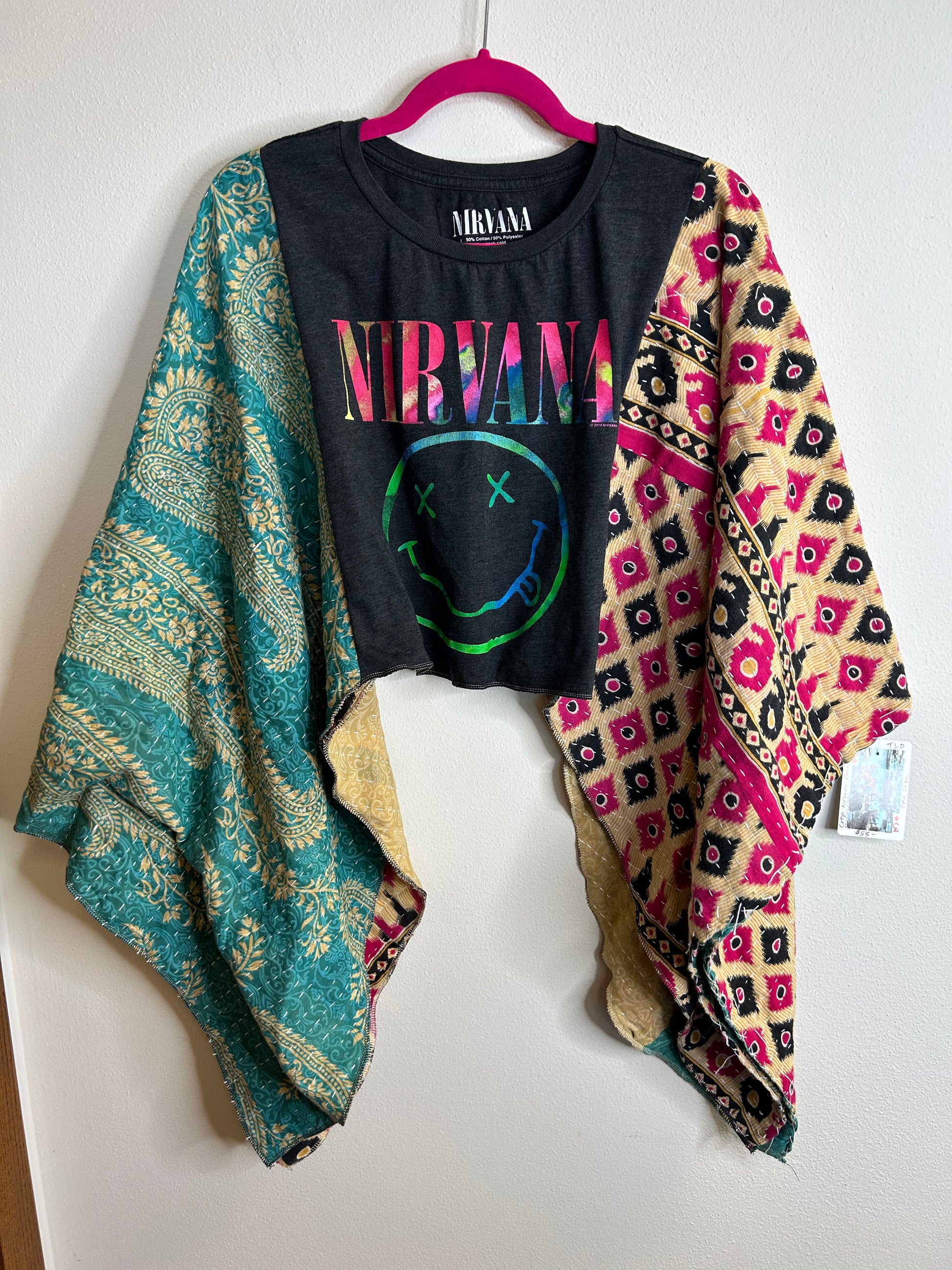 Nirvana upcycled cropped kantha poncho top -one size fits most, pullover style, fits sizes S-3x