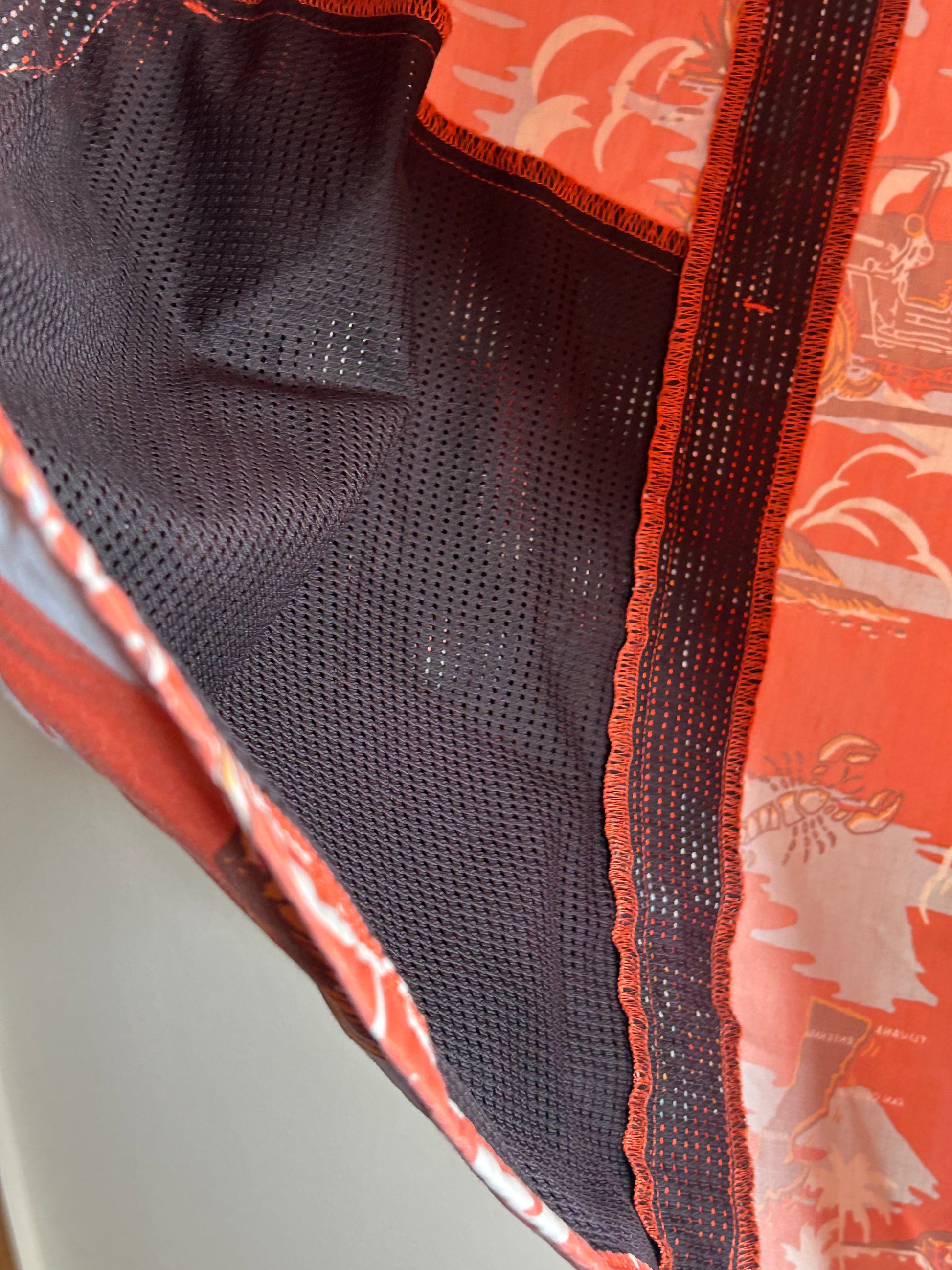 This is an Off The Grid mens XL Hawaiian button-up shirt in orange ripstop fabric. Gently used. Off the Grid Orange and Blue Scenic Print Shirt adventure outdoors mens XL
