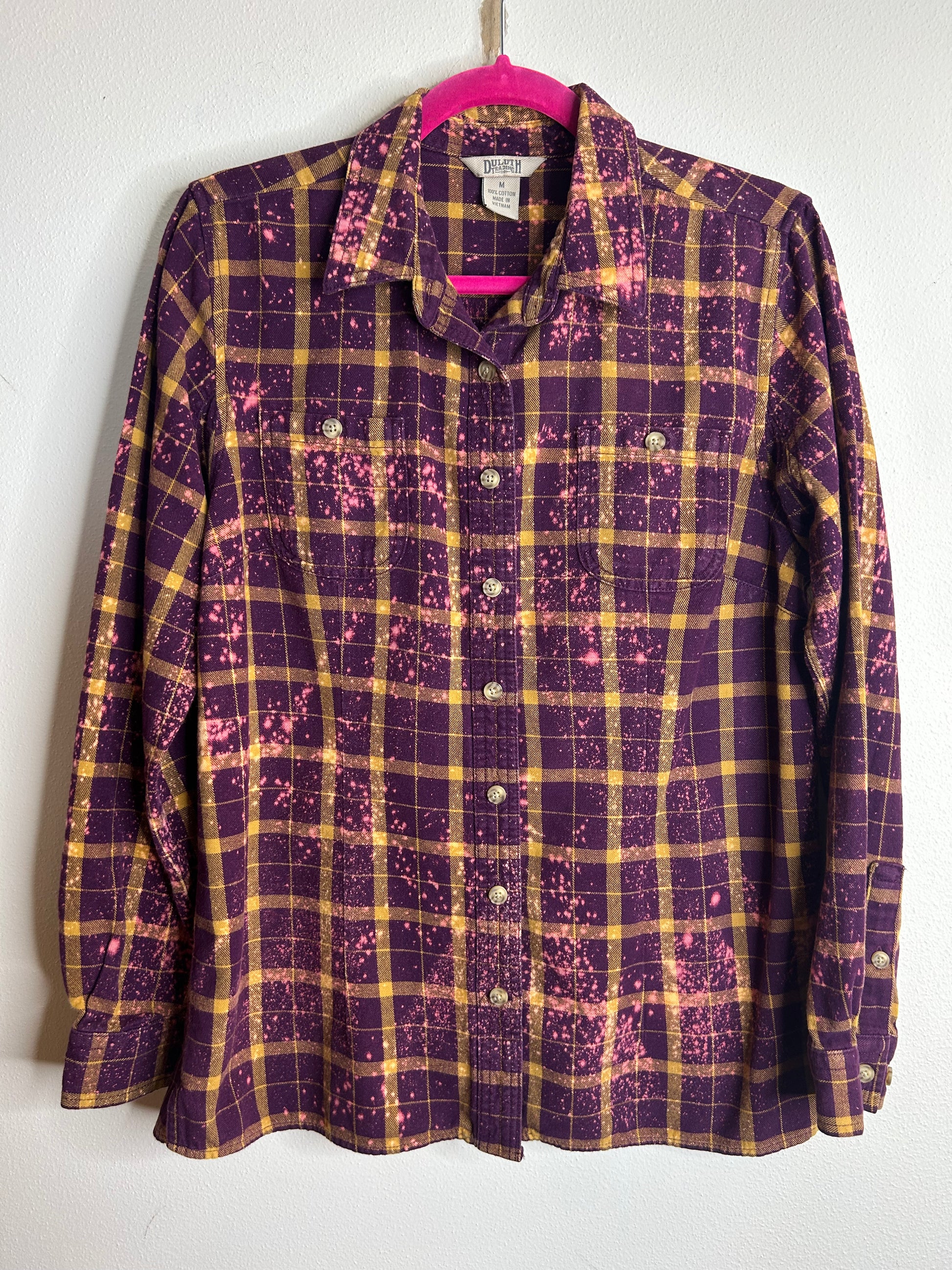Peace sign upcycled flannel shirt, womens M, 2 front pockets, button closure, bleach effect added.