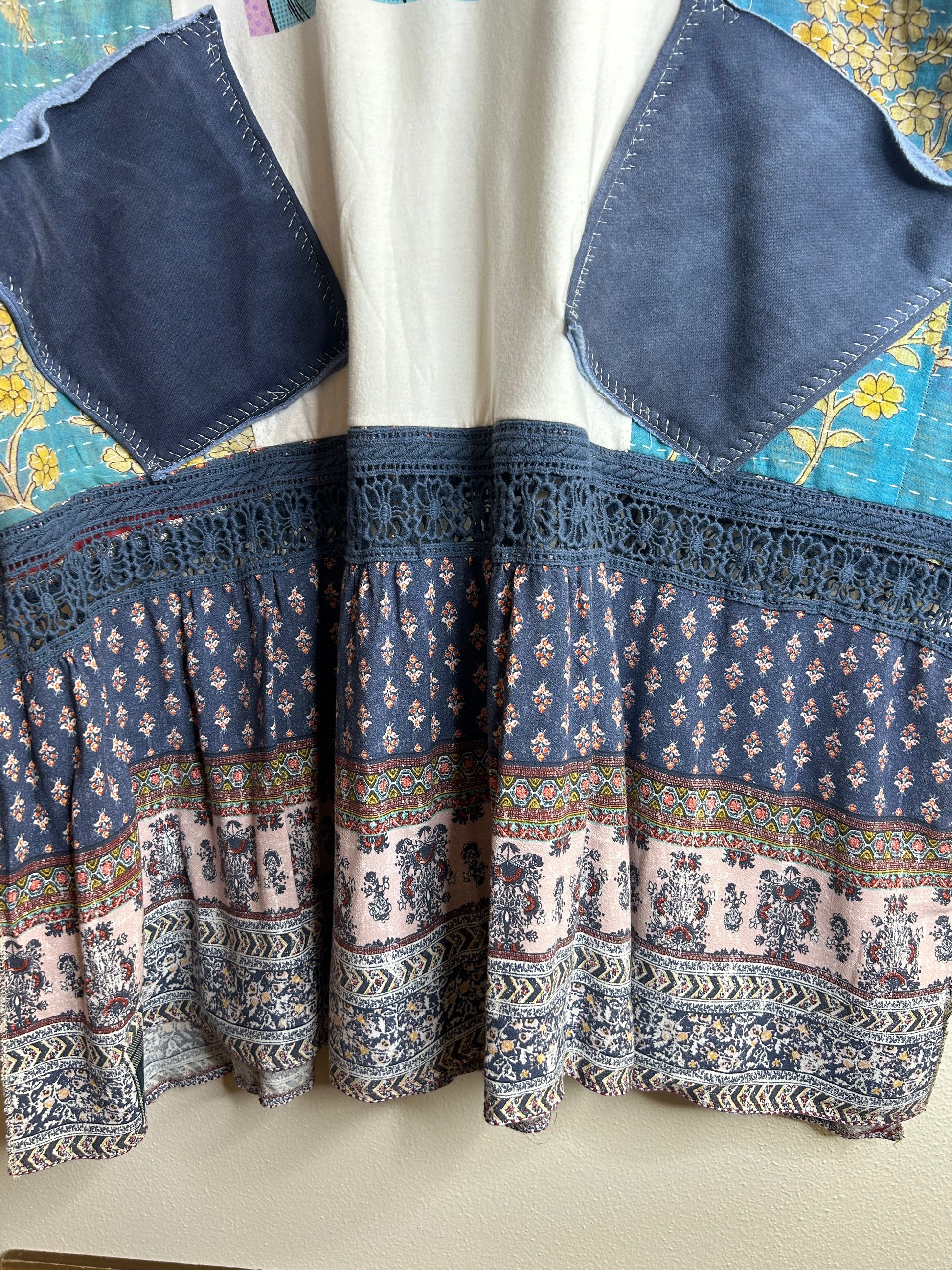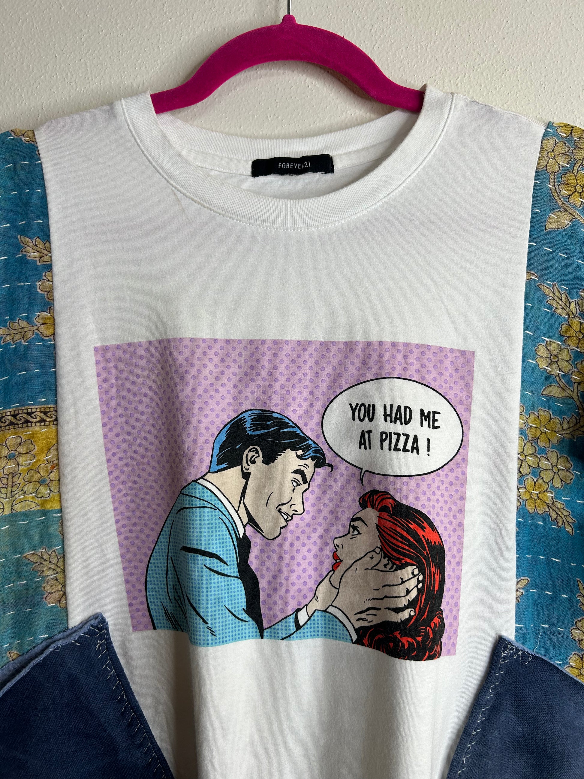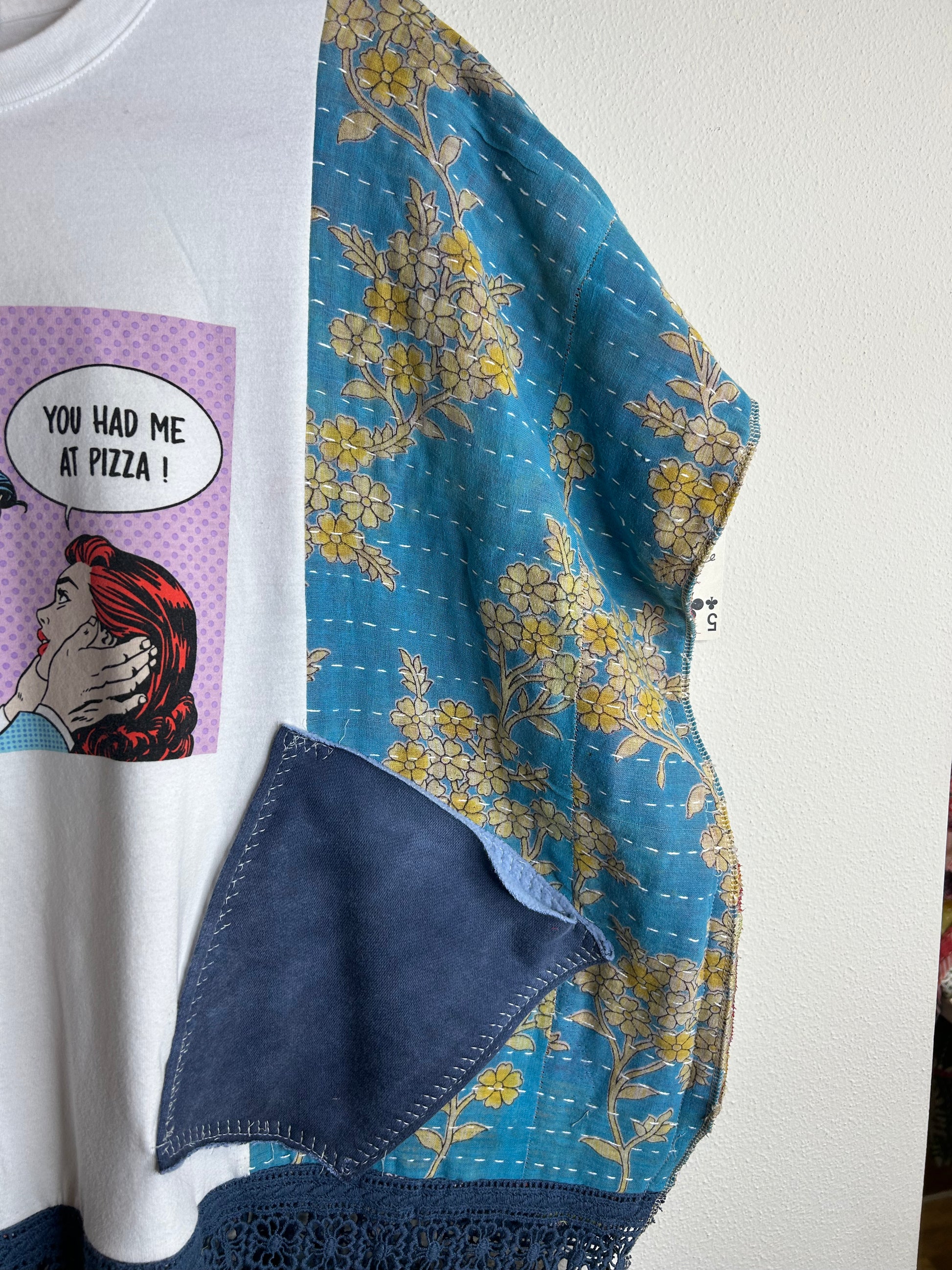 You Had Me at Pizza upcycled kantha top, like a half poncho-one size fits most, pullover style, 2 front pockets, fits sizes S-3x, longer style with added on trim