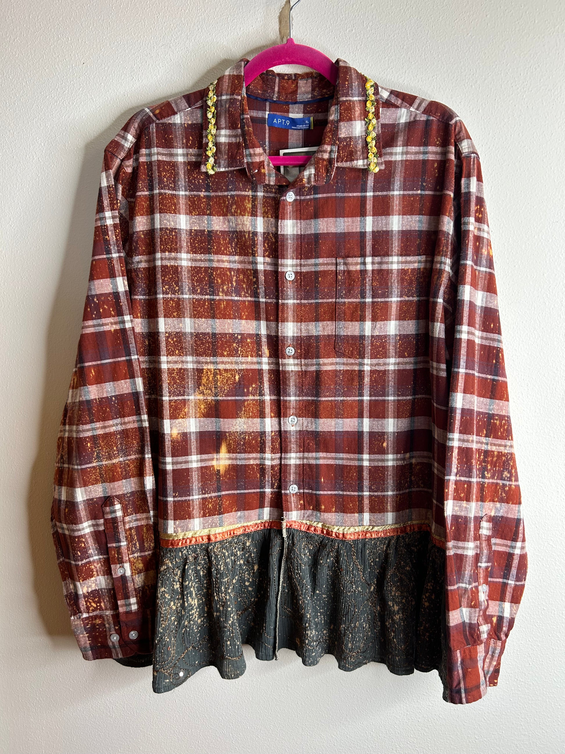 Pumpkins upcycled flannel shirt, 1 front pocket, button closure, will fit a womens 1x-2x, bleach effect added. ruffle added to hemline, trim added to collar