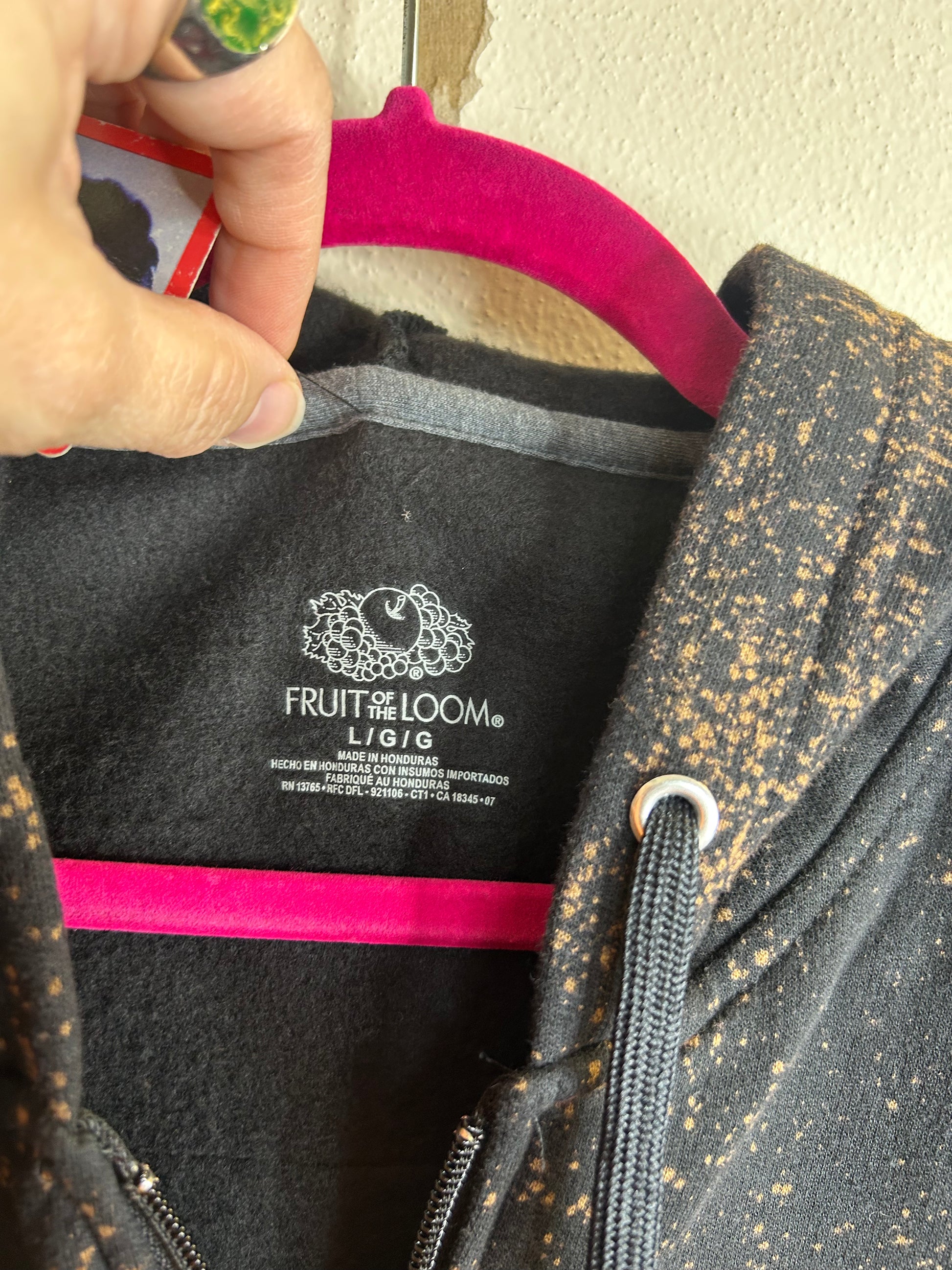Queen of the Night upcycled black hoodie, bleach effect added, zipper closure, unisex size L