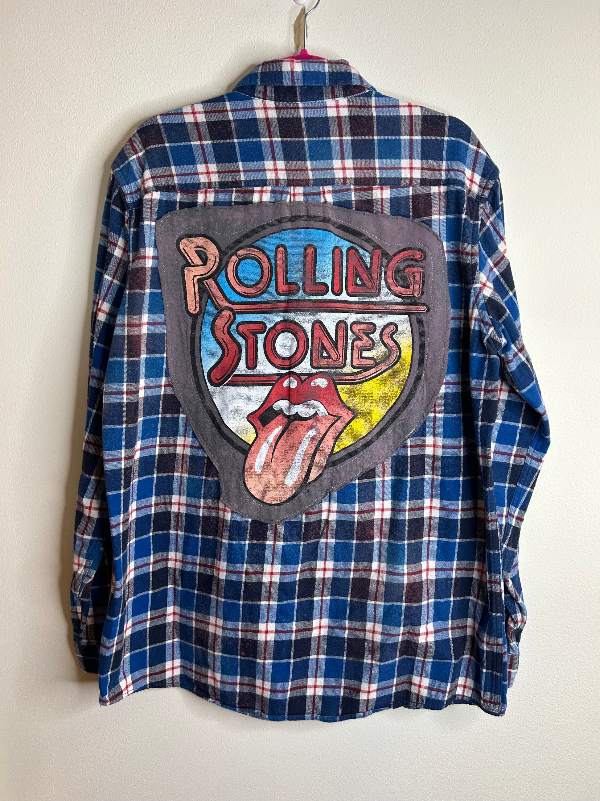 Rolling Stones upcycled flannel shirt, 1 front pocket, button closure, 100% cotton, bleach effect added.