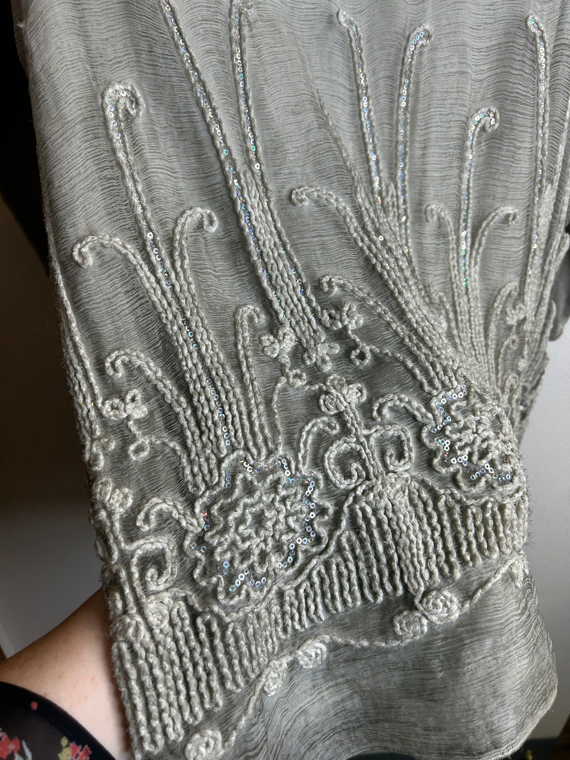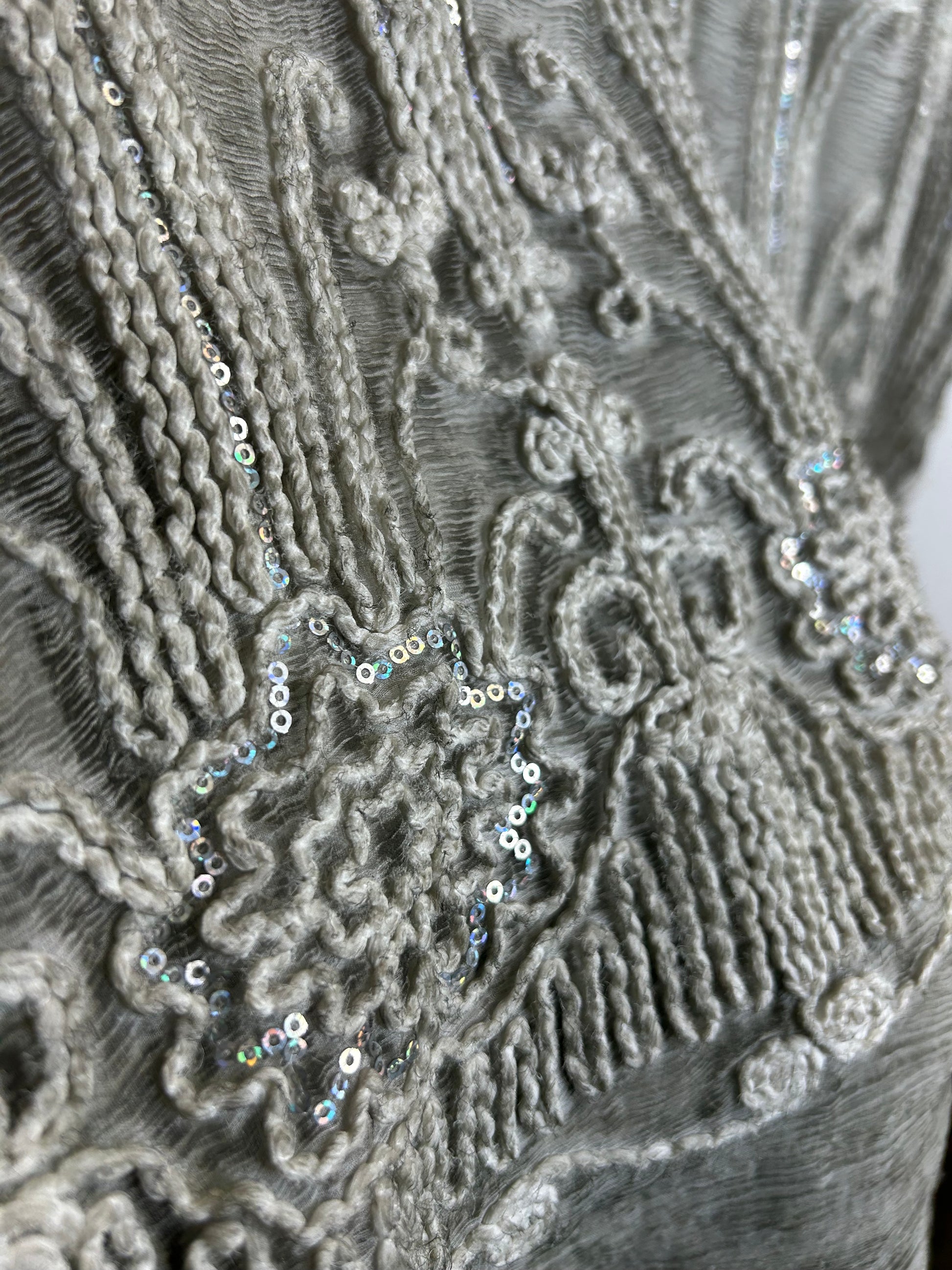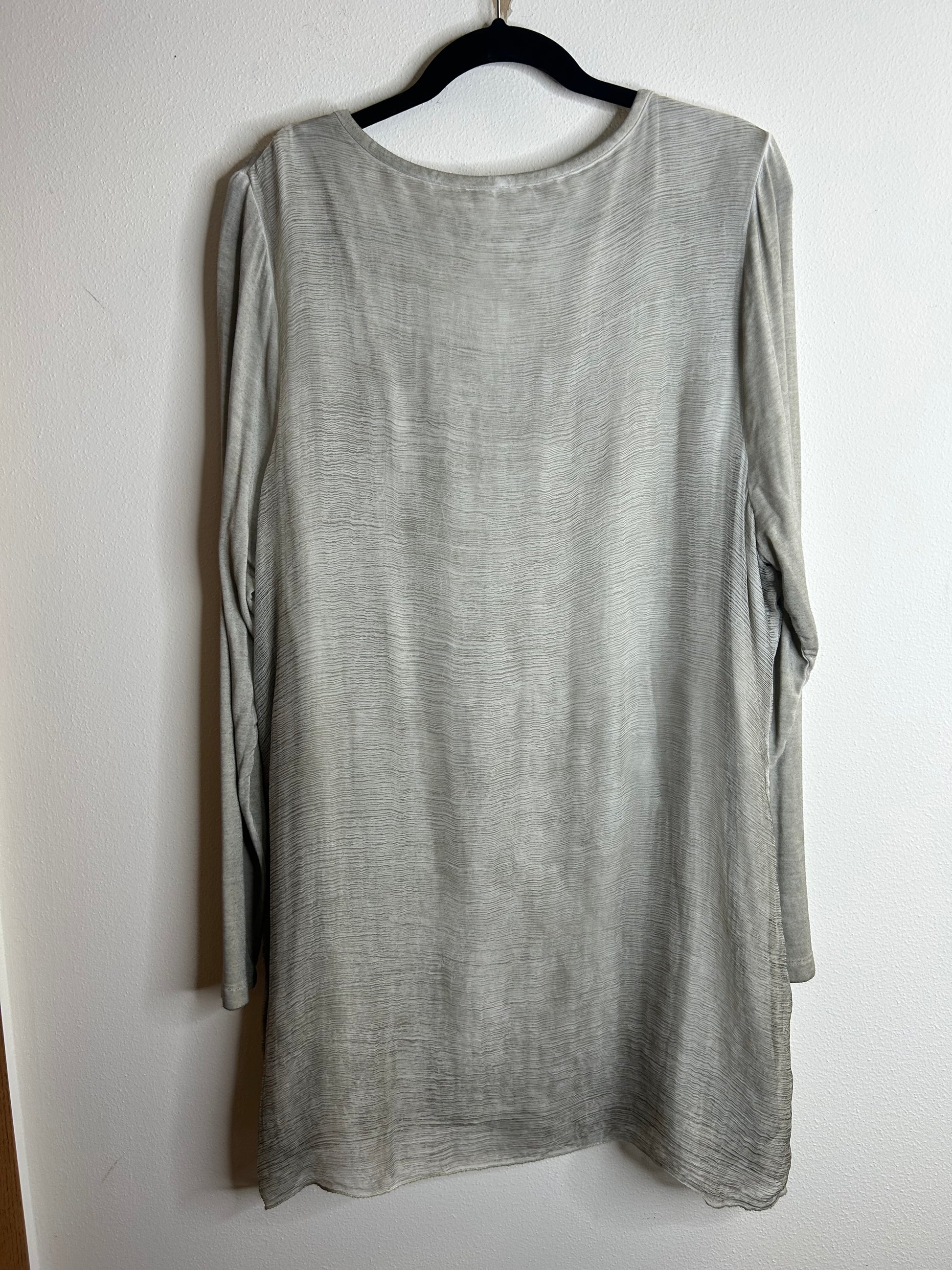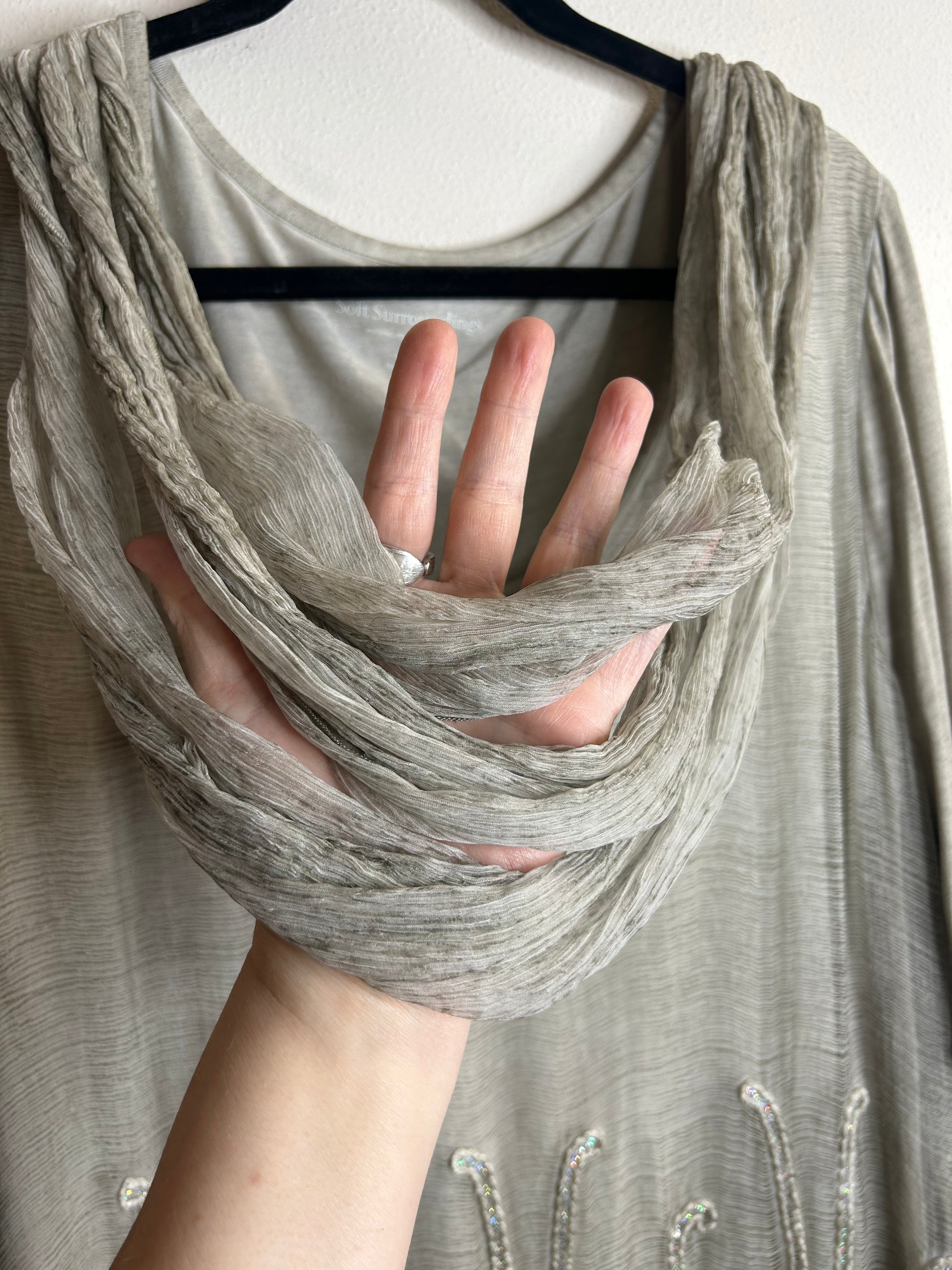 Soft Surroundings womens XL Silk Beaux Arts Tunic in a gray/shale color with delicate, sheer crinkle silk chiffon, a draped neckline, and raised floral embroidery with sequin embellishments Chic gray tunic with elegant embroidery. Soft fabric and draped neckline. Perfect for versatile styling. Ethereal, fairy, mystical, elegant