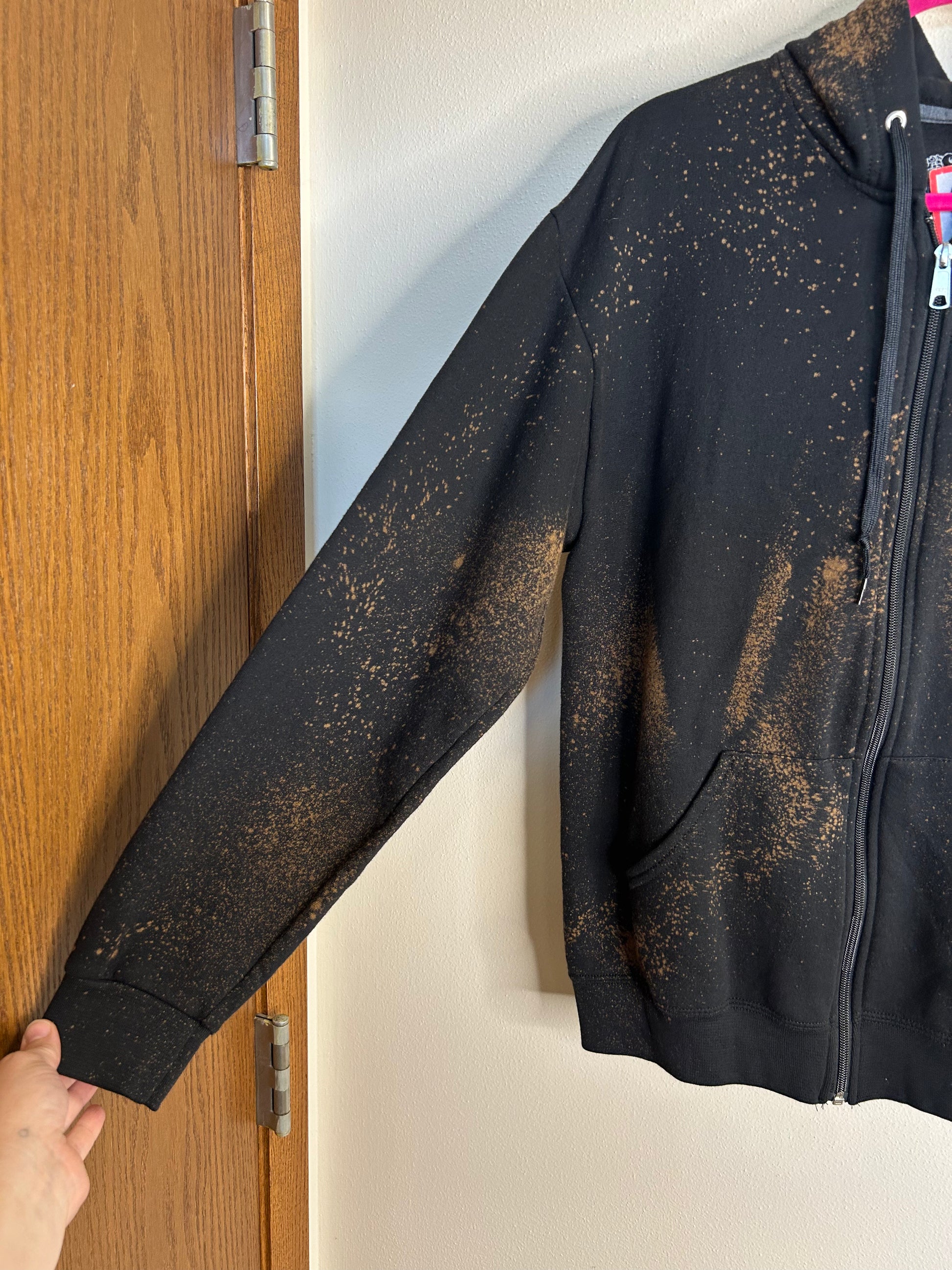 The Pauper upcycled hoodie unisex size M, zipper closure, 2 front pockets, 50% cotton, 50% polyester, bleach effect added, handmade patch, wash and dry on low/cool settings or handwash and line dry.
