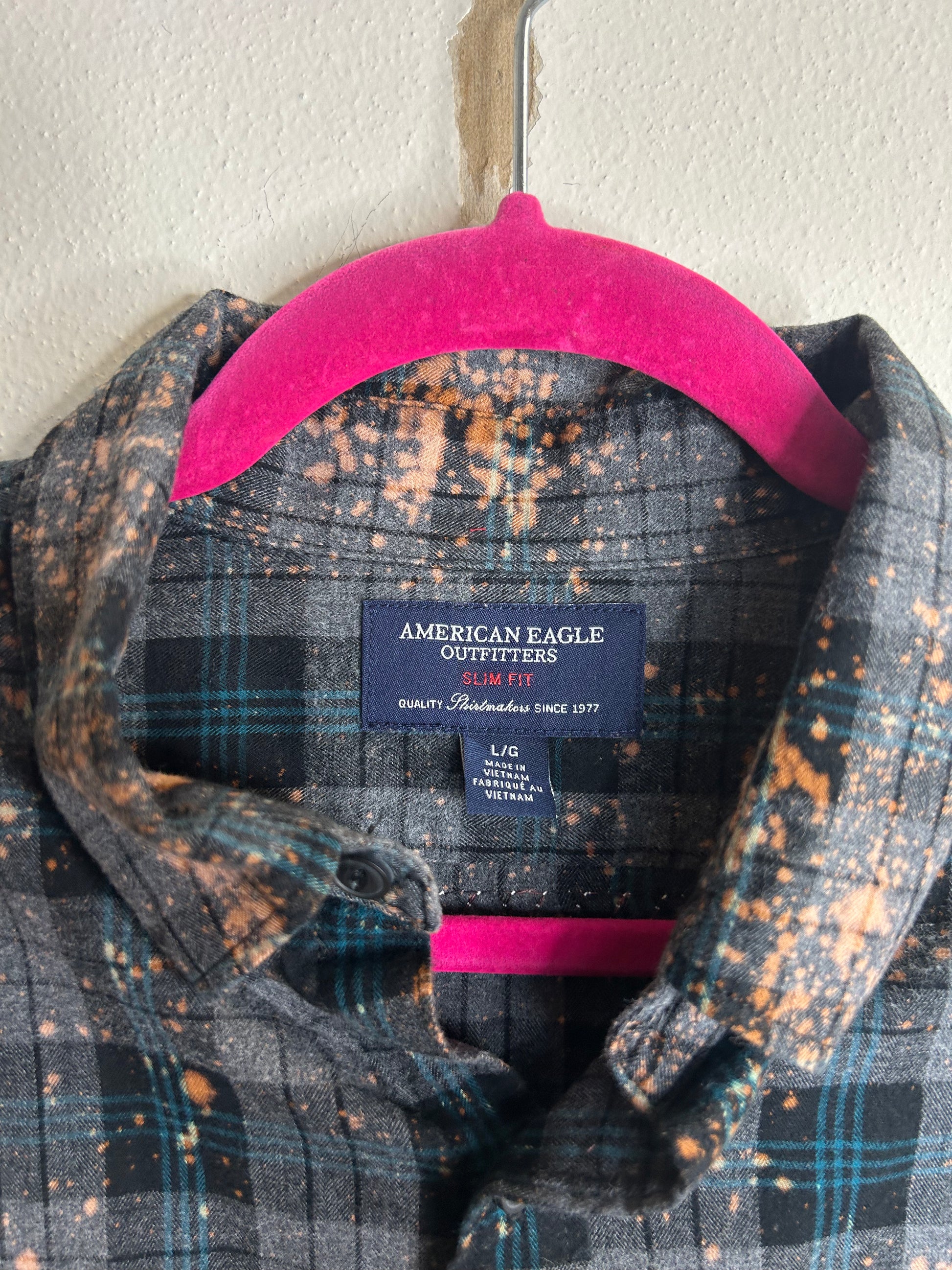 Volbeat upcycled flannel shirt, unisex size L, 1 front pocket, button closure, bleach effect added.