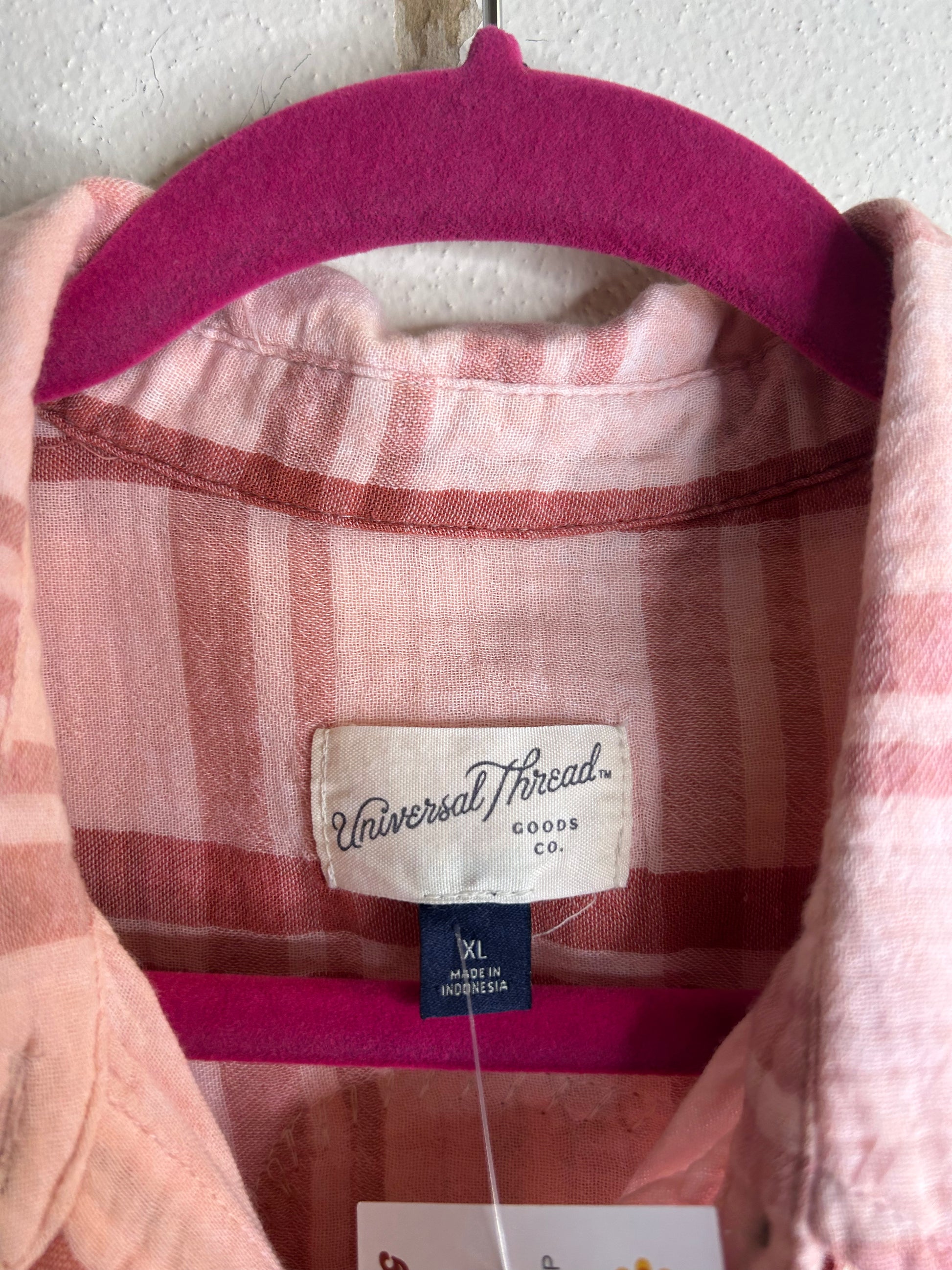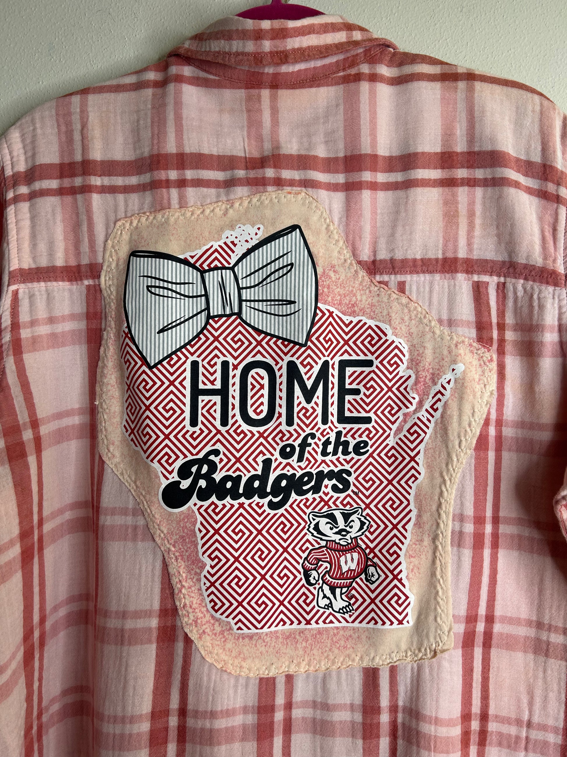 Wisconsin Badgers upcycled flannel shirt, womens size XL, 1 front chest pocket, button closure. Bleach effect added.