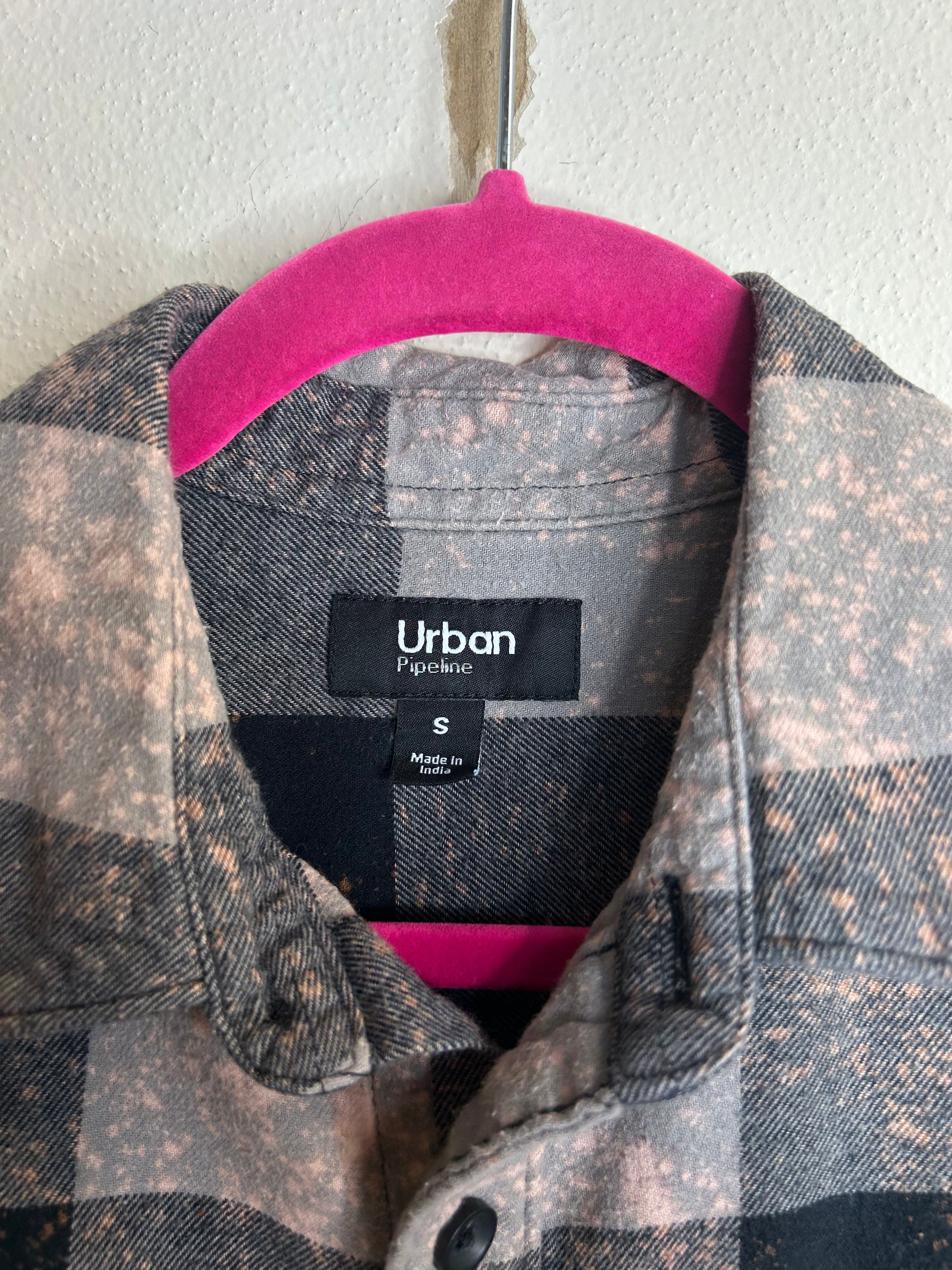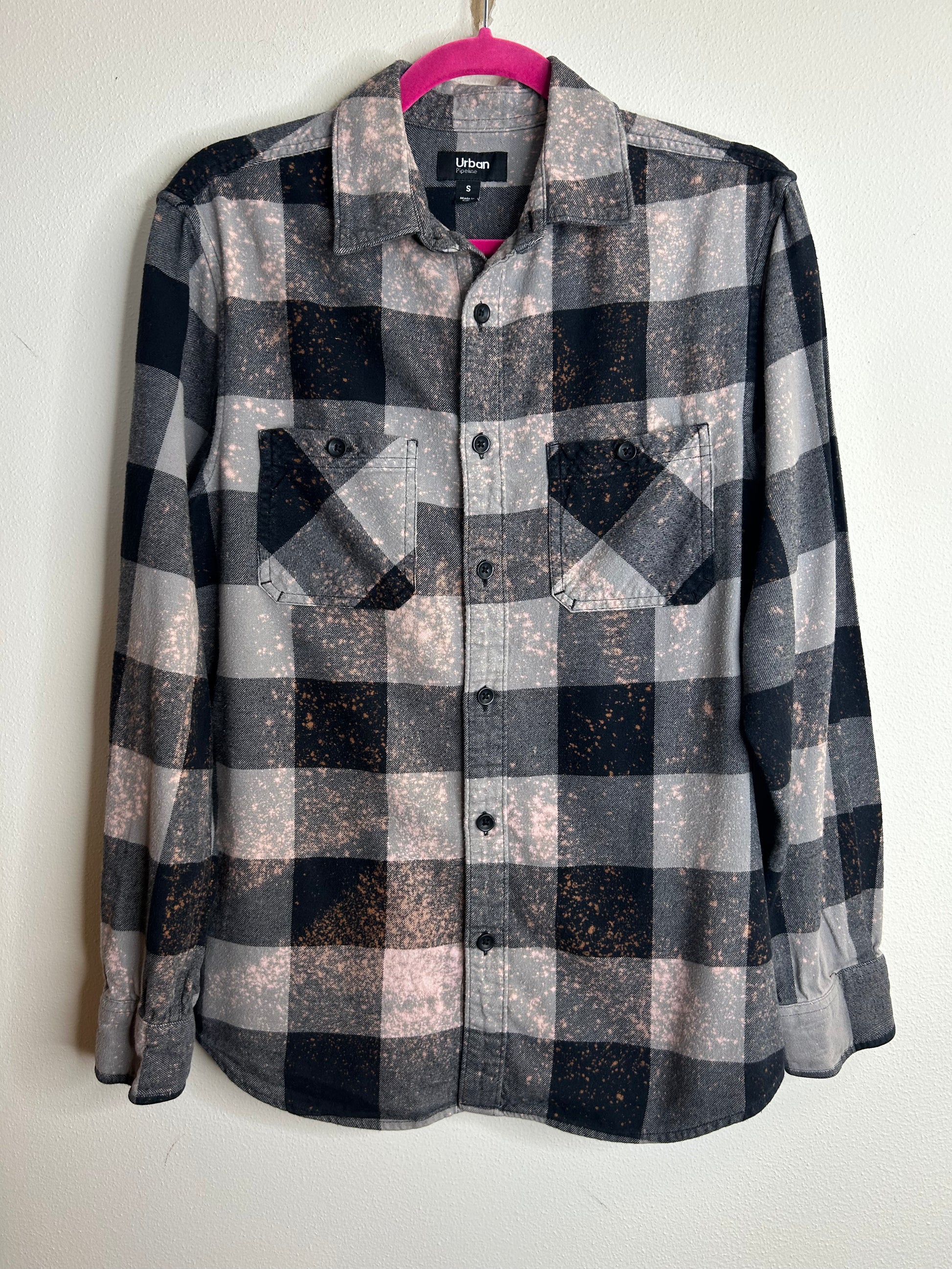 Witches Brew upcycled flannel shirt, unisex size S, 2 front pockets, button closure, bleach effect added. Handmade patch.